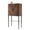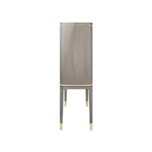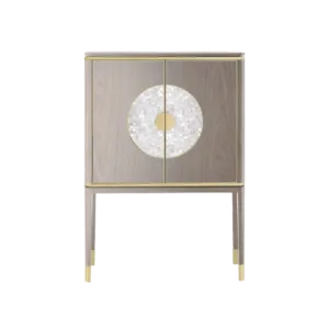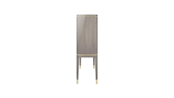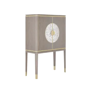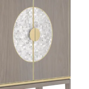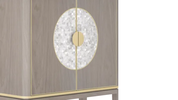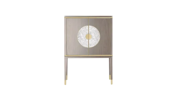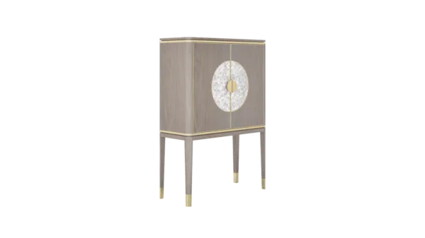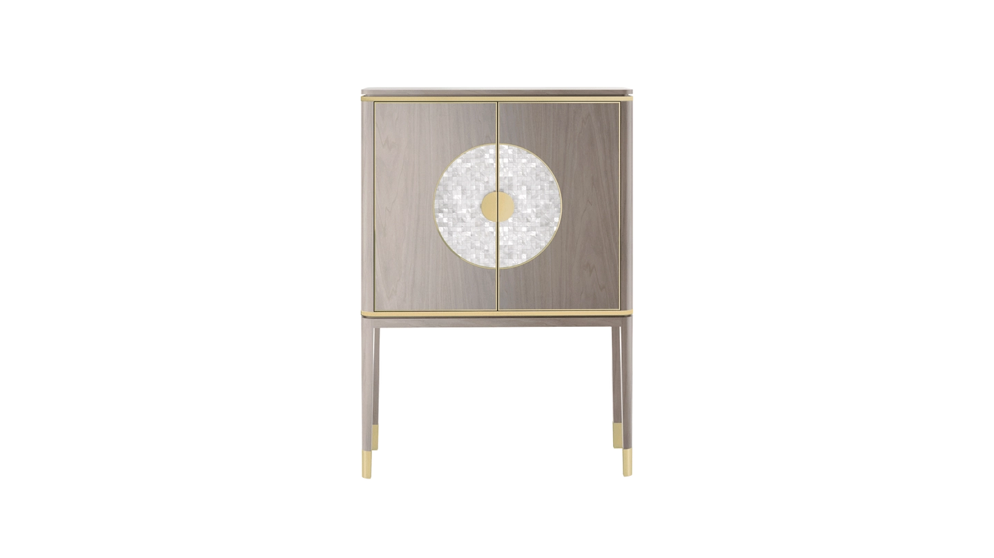 The striking SEVILLE tall cabinet uses elegant materials to elevate a pared-back silhouette. Crafted from glossy wood veneer, details of brushed brass and a circular inlay of white mother-of-pearl catch the light and the eye.