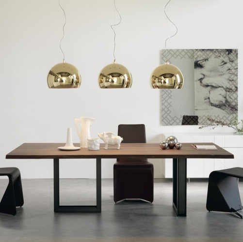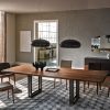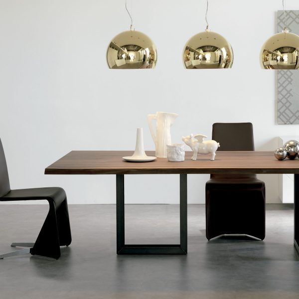 The Sigma is a stunning canaletto walnut or burnt oak finish wood-topped table with natural irregular edges. It features a varnished metal base and is available in a choice of sizes.