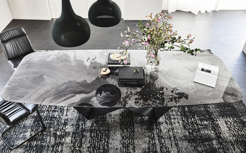 The Cattelan Italia Skorpio CrystalArt Table combines functionality with artistic design. The table features a choice of crystal-patterned glass top finishes in a variety of shapes and sizes.