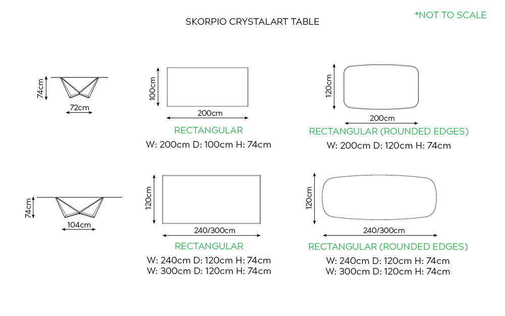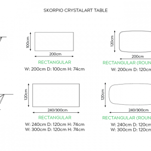 Size | Rectangular – W: 200cm D: 100cm H: 74cm, Rectangular – W: 240cm D: 120cm H: 74cm, Rectangular – W: 300cm D: 120cm H: 74cm, Rectangular (Rounded Edges) – W: 200cm D: 120cm H: 74cm, Rectangular (Rounded Edges) – W: 240cm D: 120cm H: 74cm, Rectangular (Rounded Edges) – W: 300cm D: 120cm H: 74cm |