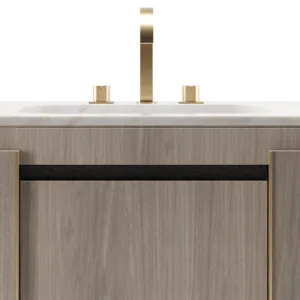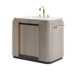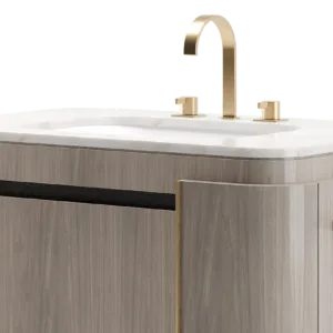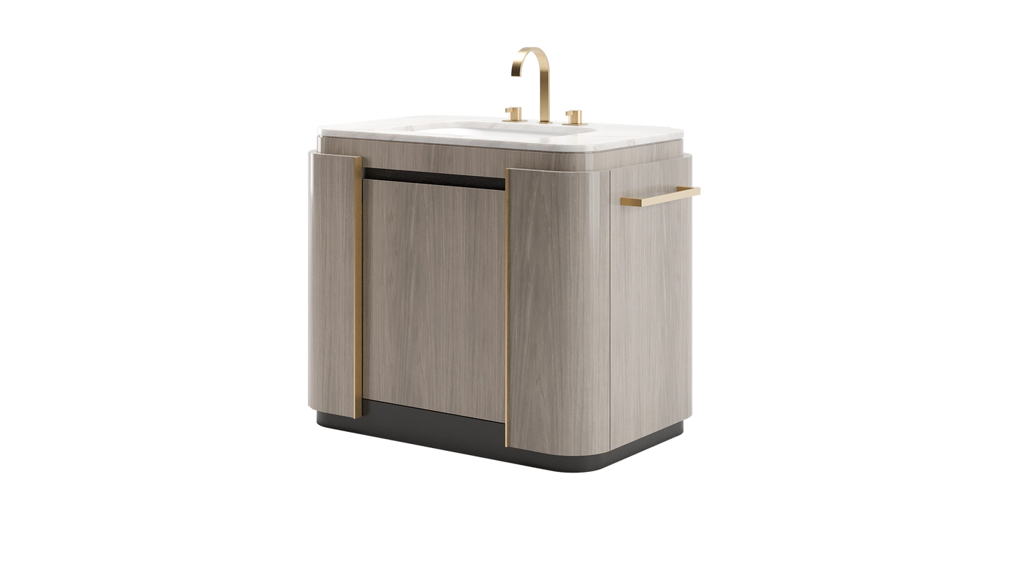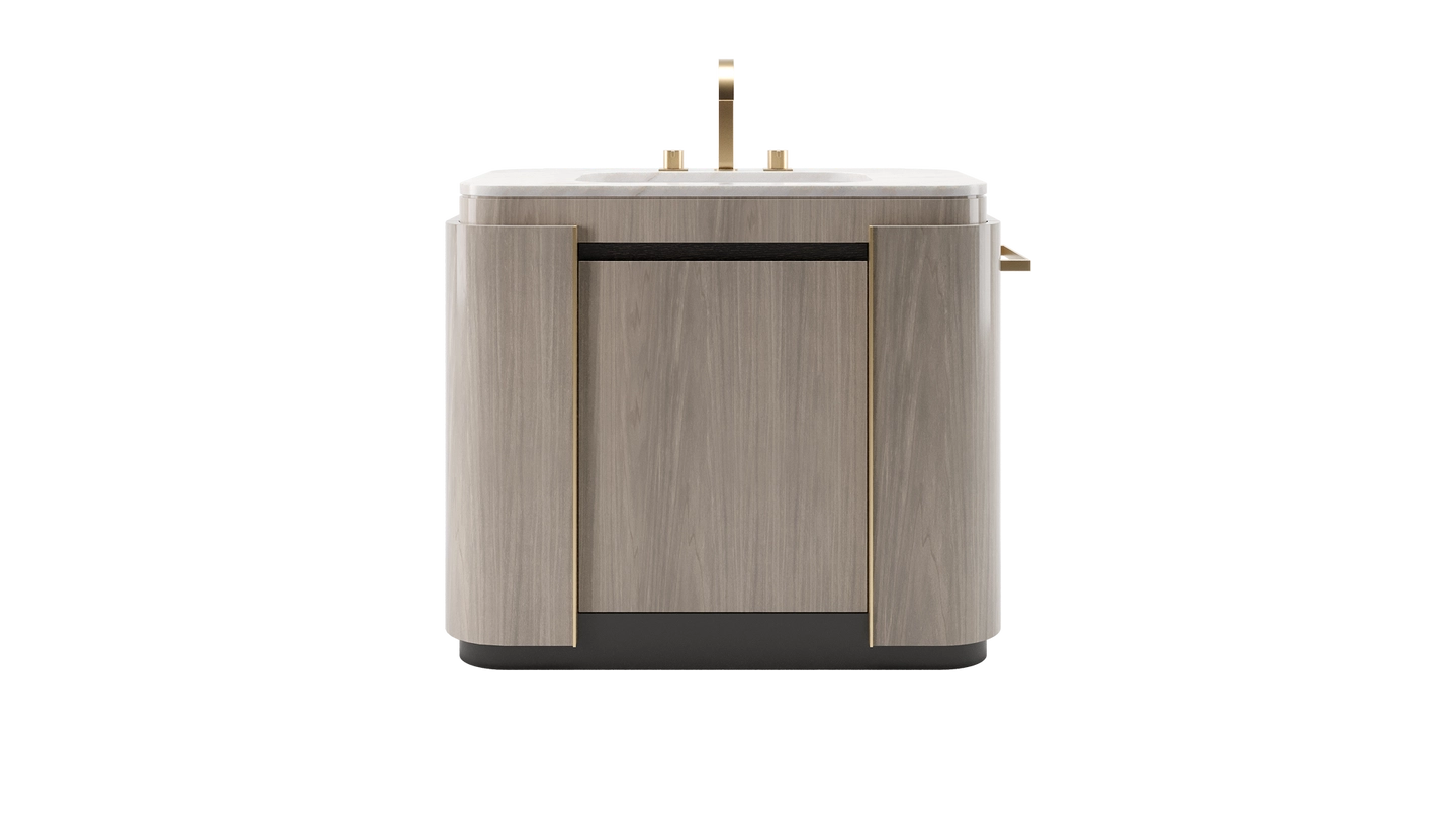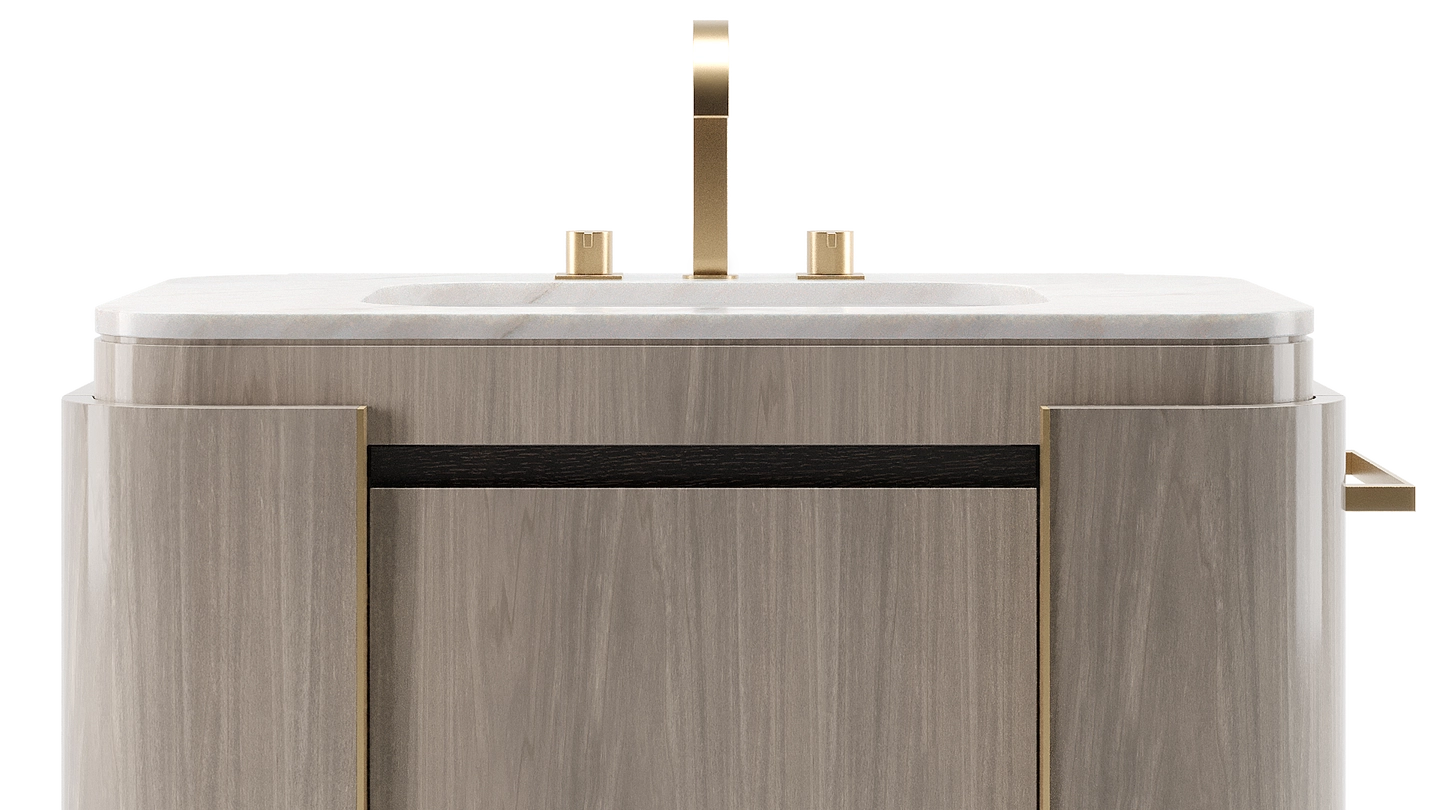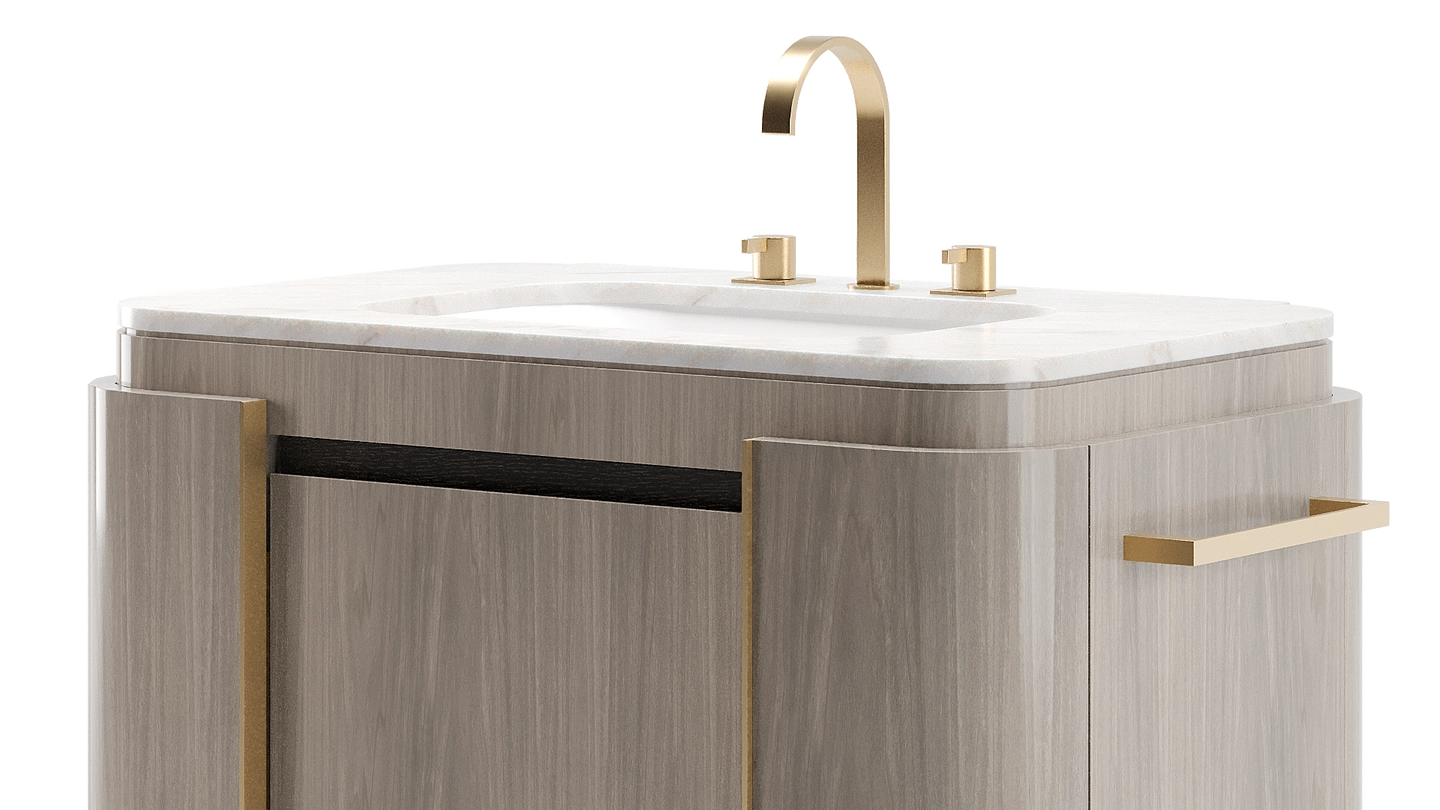 With its elegantly curved form, the SOCHI vanity brings a feminine feel to your bathroom. It features a glossy veneer and brass accents in soft tones.