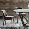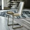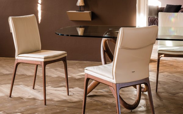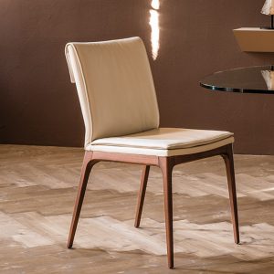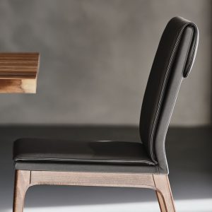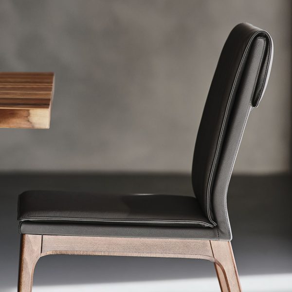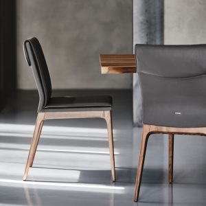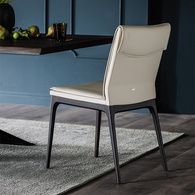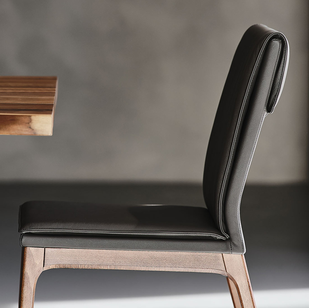 The Sofia is a contemporary dining chair with tapered wooden legs and an upholstered seat and backrest with a veil-like cushion layered over the seat. Available with a high or low back and with or without arms in a wide selection of leather or synthetic leather finishes.