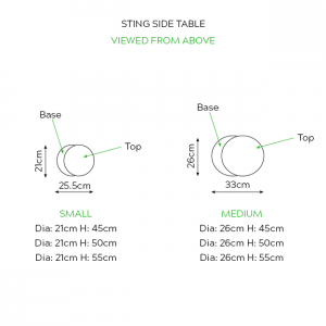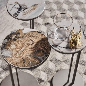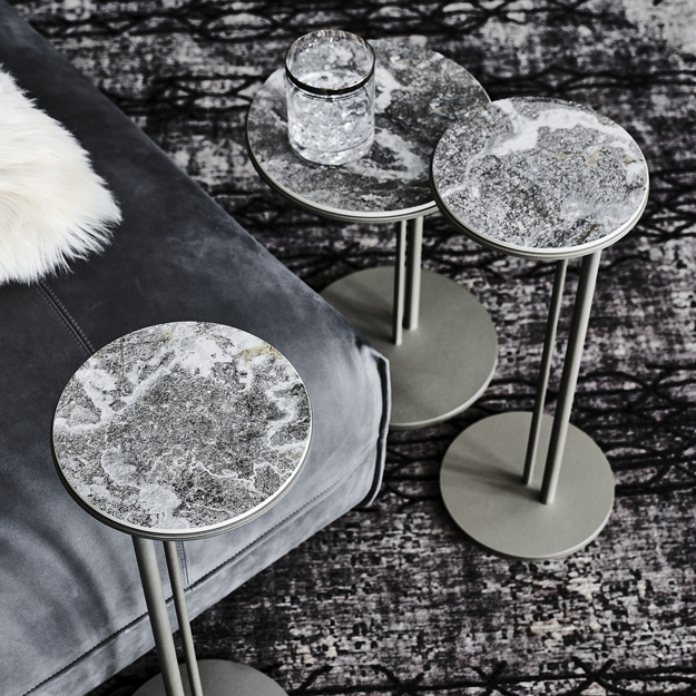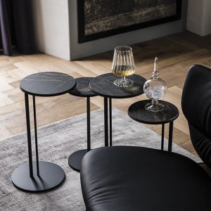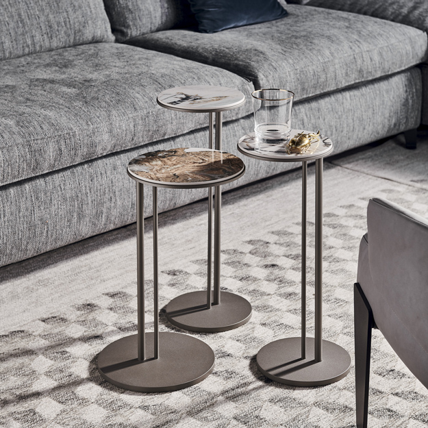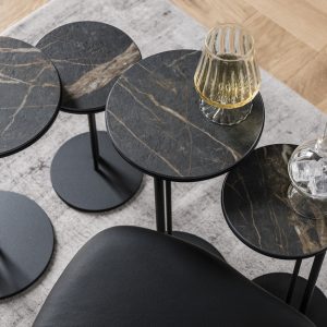 An elegant collection of side tables, complete with a stylish round ceramic top, an offset base and sleek double stem . Available in varying sizes that can be nested together in sets to create unique compositions.
