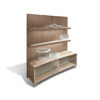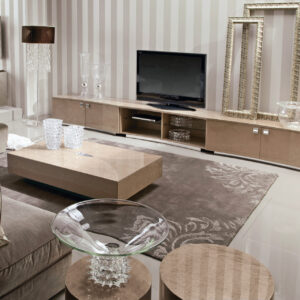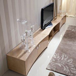 Base only for TV with 2 wooden doors finished in high gloss polyester champagne bird’s eye maple veneer. 2 adjustable inside glass shelves. Chrome stainless steel base and handles.