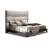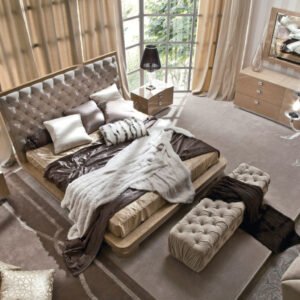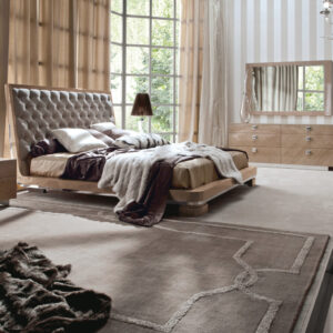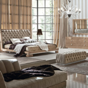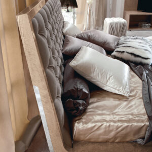 Bed in champagne bird’s eye maple veneer finished in high gloss polyester. Headboard available in first grade leather, velvet or suede fabric. Chrome stainless steel feet.