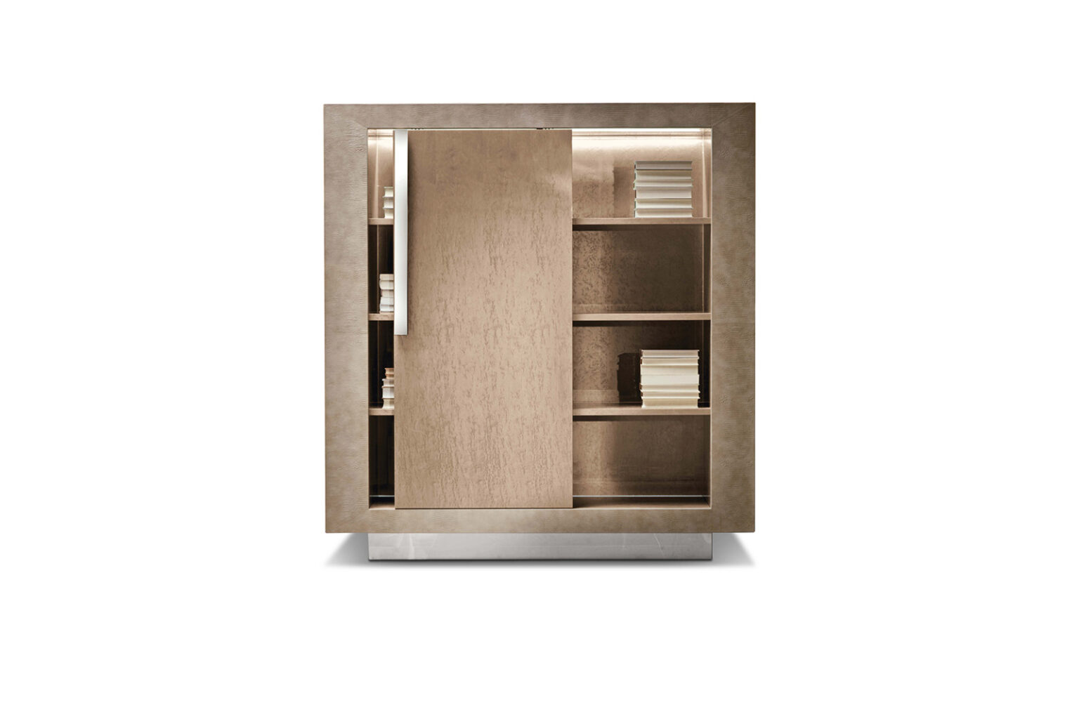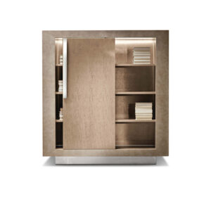 Bookcase finished in combination of high gloss polyester champagne bird’s eye maple veneer and printed iguana leather. Special led light sytem including touching switch.Chrome stainless steel handle and base.