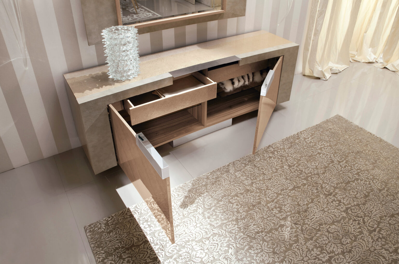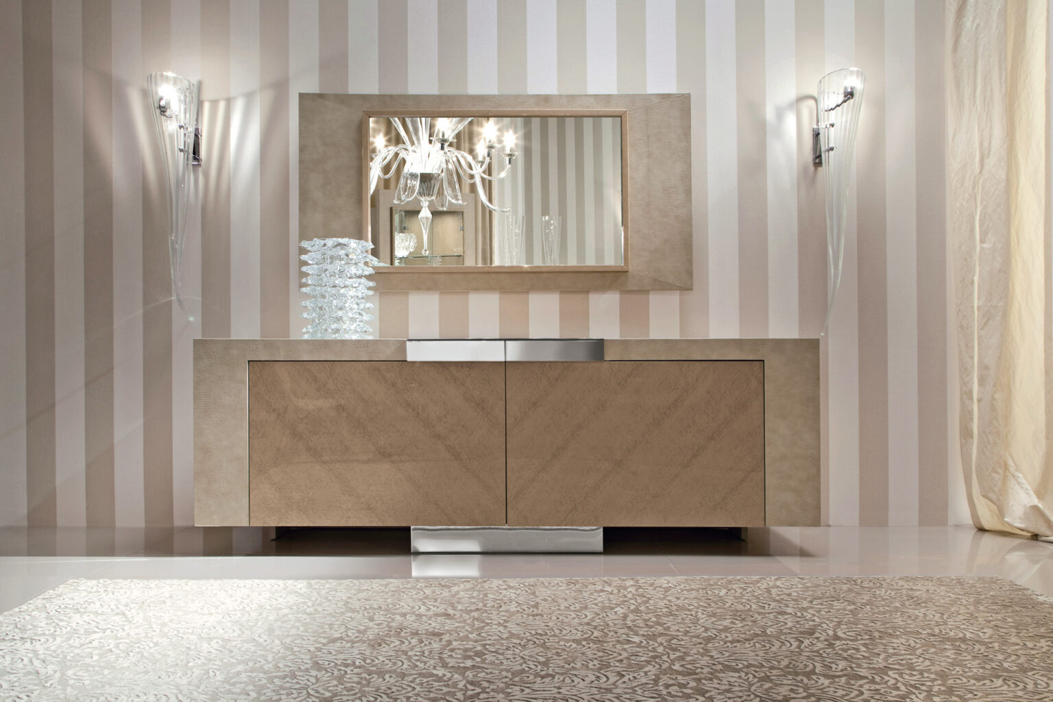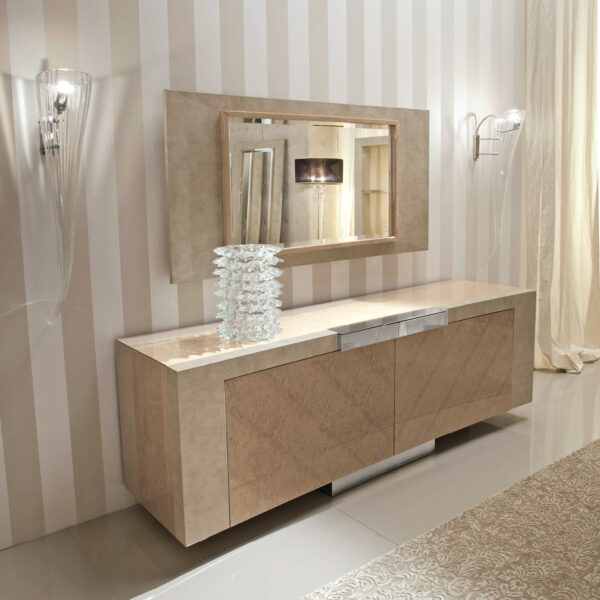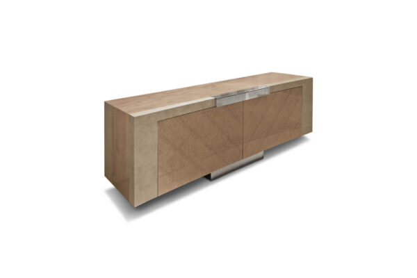 2 doors buffet with combination of champagne bird’s eye maple veneer and iguana printed leather. High gloss polyester finish.