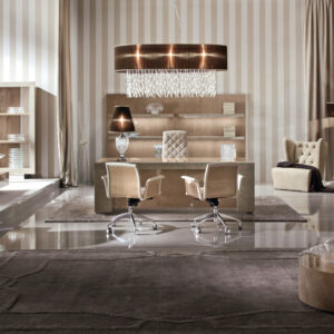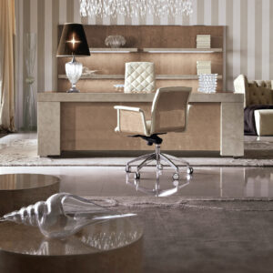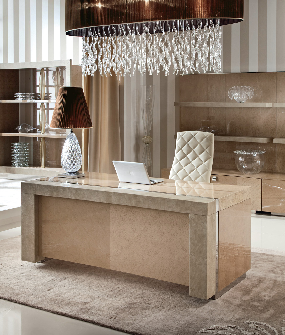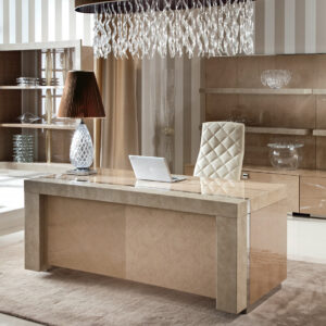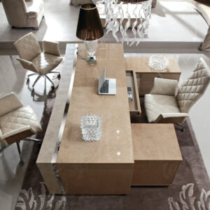 Desk finished in combination of high gloss polyester champagne bird’s eye maple veneer and printed iguana leather. Stainless steel chrome base and detail in the top.