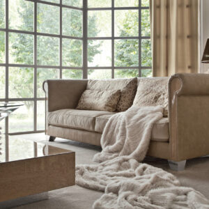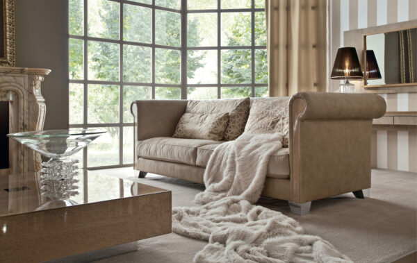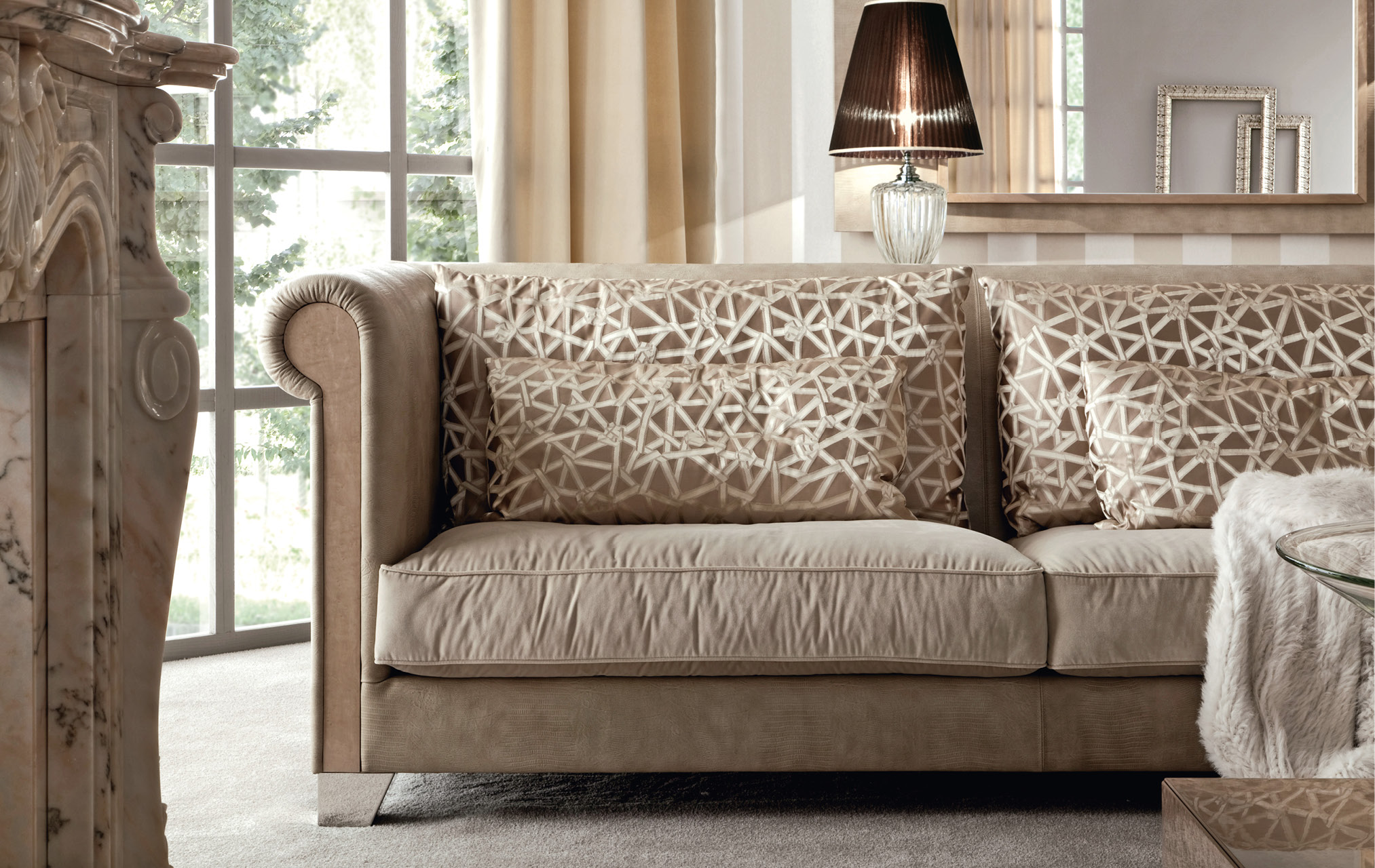 Fixed sofa with n. 2 big + 2 small pillows 2 side fronts in high gloss polyester bird’s eye maple veneer. Chrome stainless steel feet.