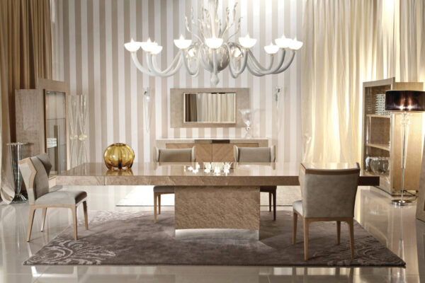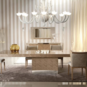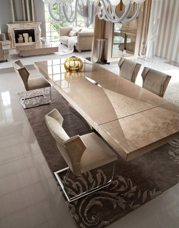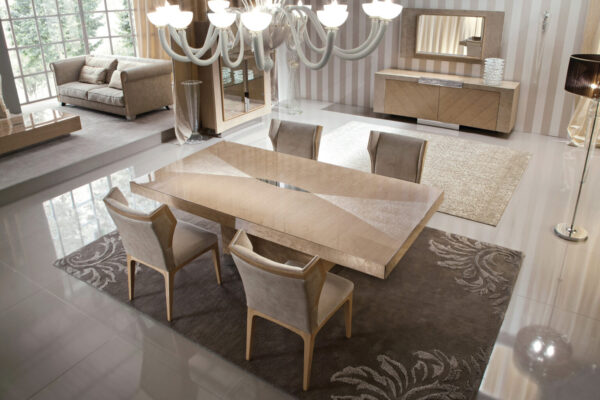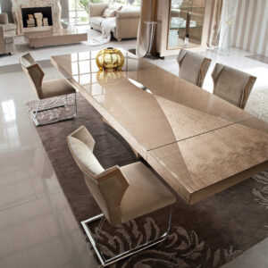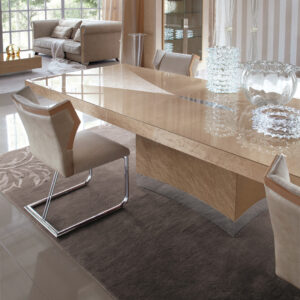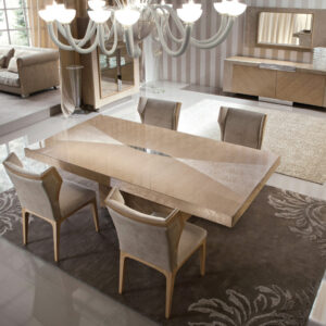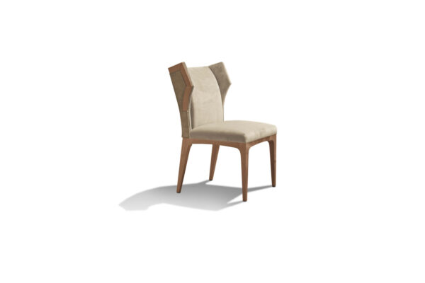 Side chair in bleached solid beech wood with back and seat in combination of printed iguana leather and velvet or suede fabric. Base with 4 legs in wood. Fabric needs for seat inside/back: mt. 1,4 Leather needs for outside/back:mt. 1,4