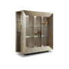 2 glass doors vetrine with combination of champagne bird’s eye maple veneer and printed Iguana leather. High gloss polyester finish. Chrome stainless steel handles and base. 2 halogene lights including switch.