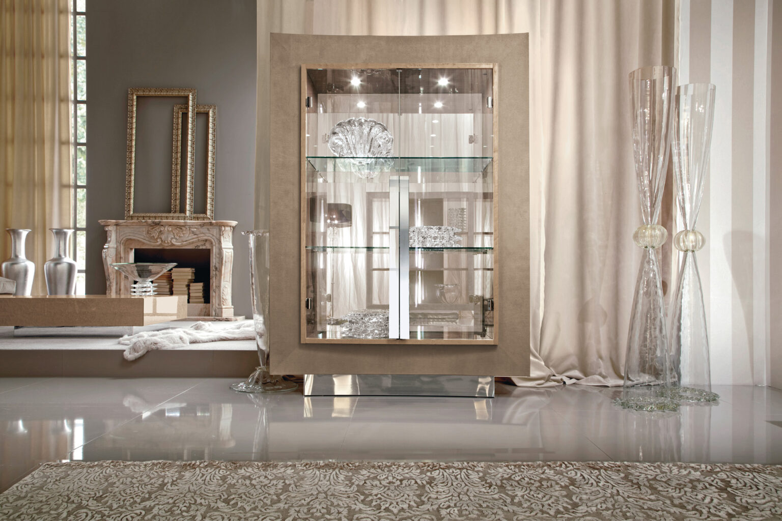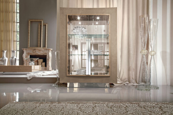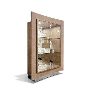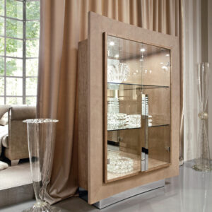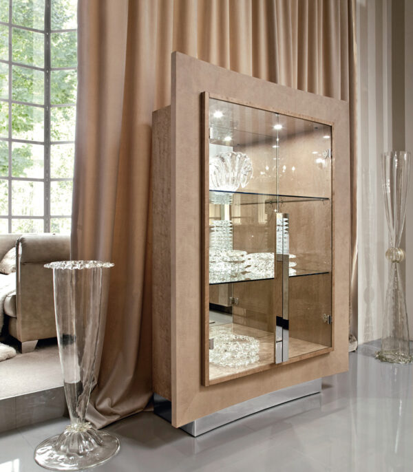 2 glass doors vetrine with combination of champagne bird’s eye maple veneer and printed Iguana leather. High gloss polyester finish. Chrome stainless steel handles and base. 2 halogene lights including switch.