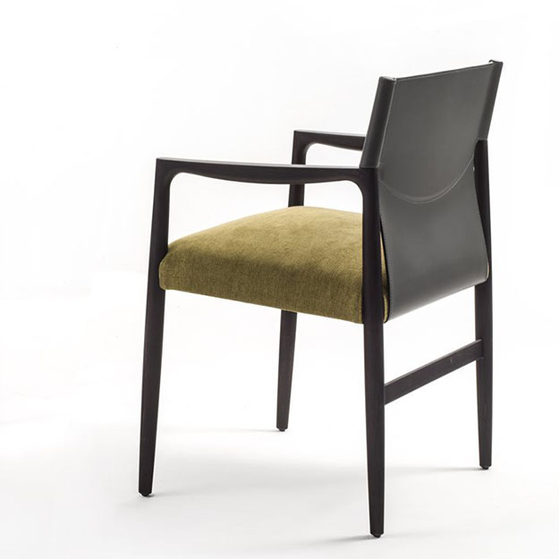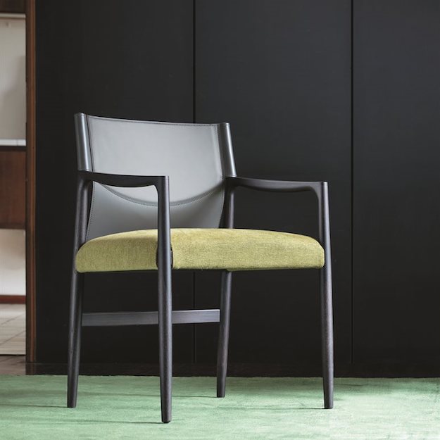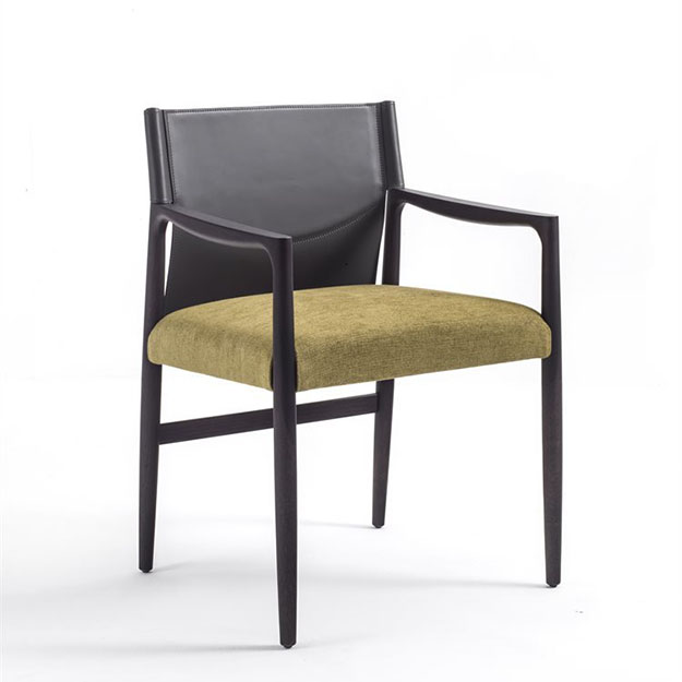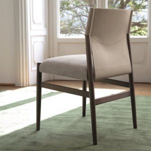 The Porada Sveva Chair is an elegant dining chair with wood frame and gently tapered legs supporting an upholstered seat and complemented by a smooth regenerated hide leather backrest. Select from a range of wood, fabric and leather finishes for a bespoke look. Available with or without arms.