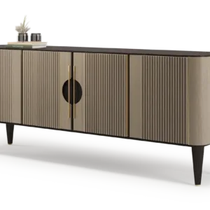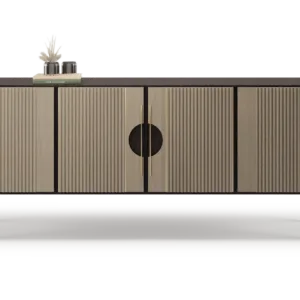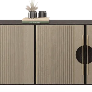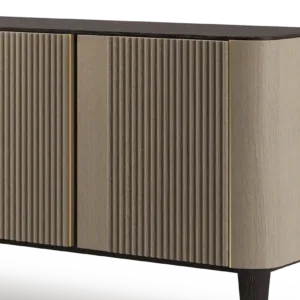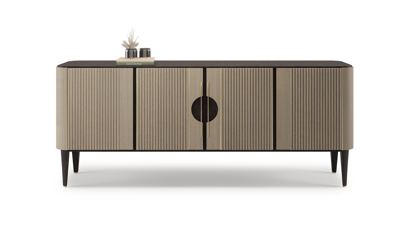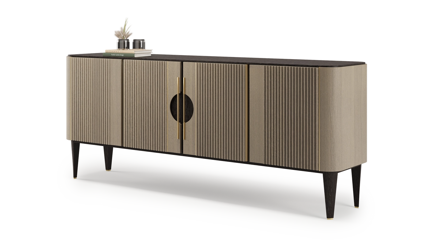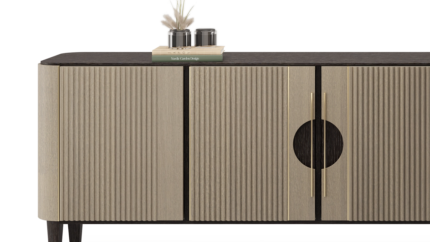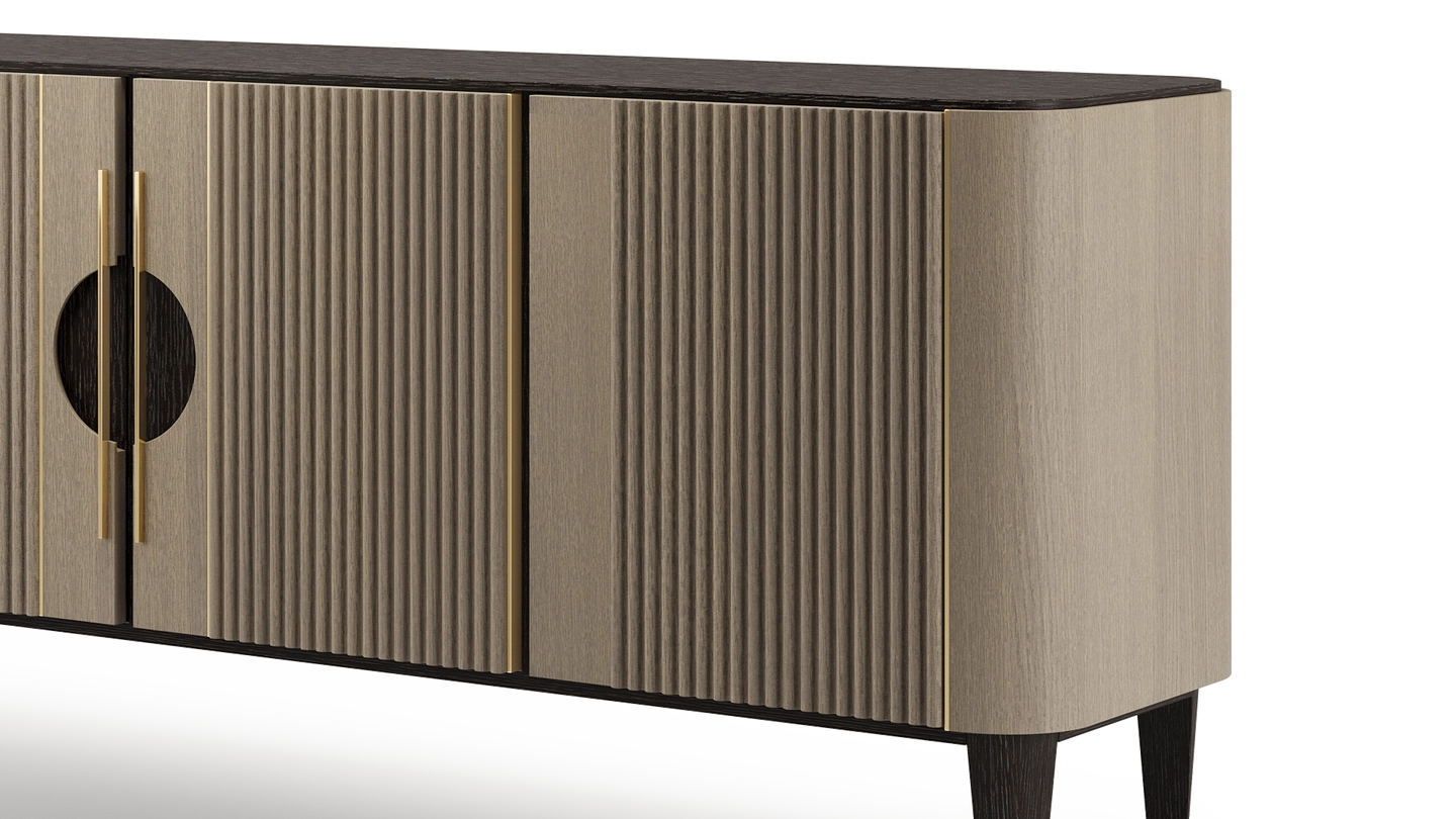 Employing a clean-cut profile, the suave TAIPEI sideboard adds texture and dimension to its form with fluted door fronts and contrasting shades of solid wood and veneer. Slimline brushed-brass accents provide the final touch.