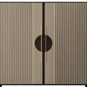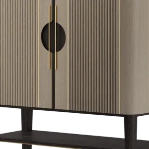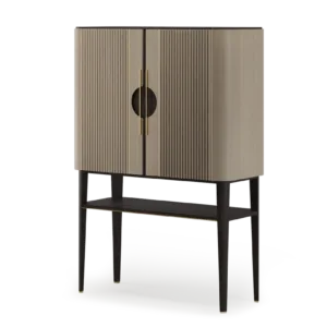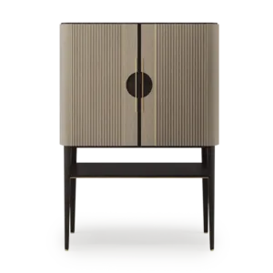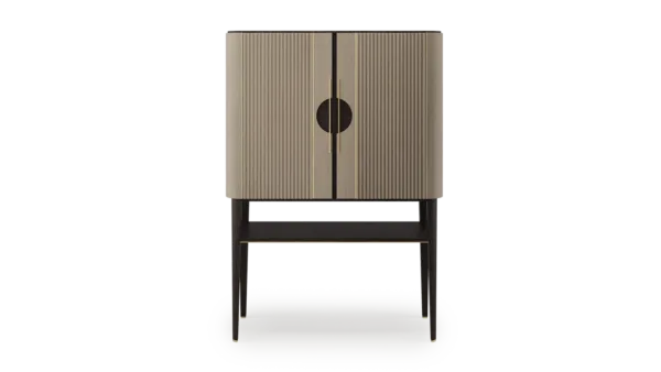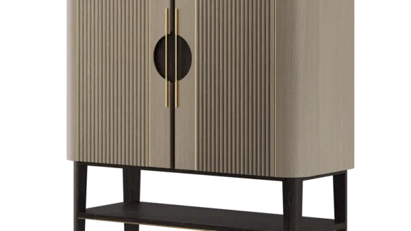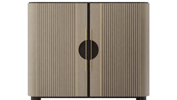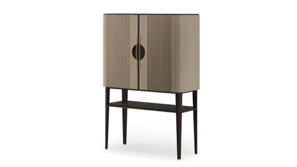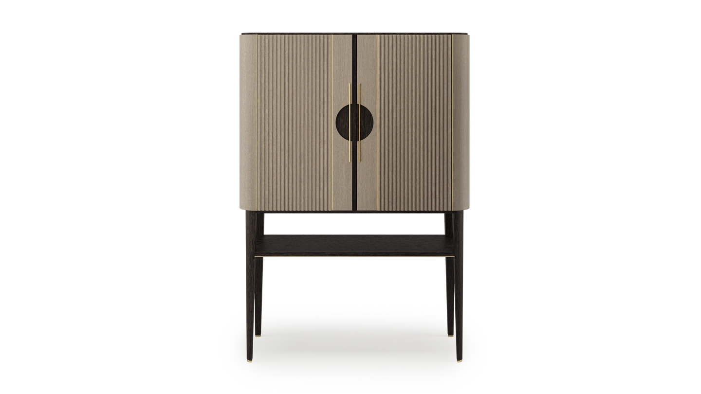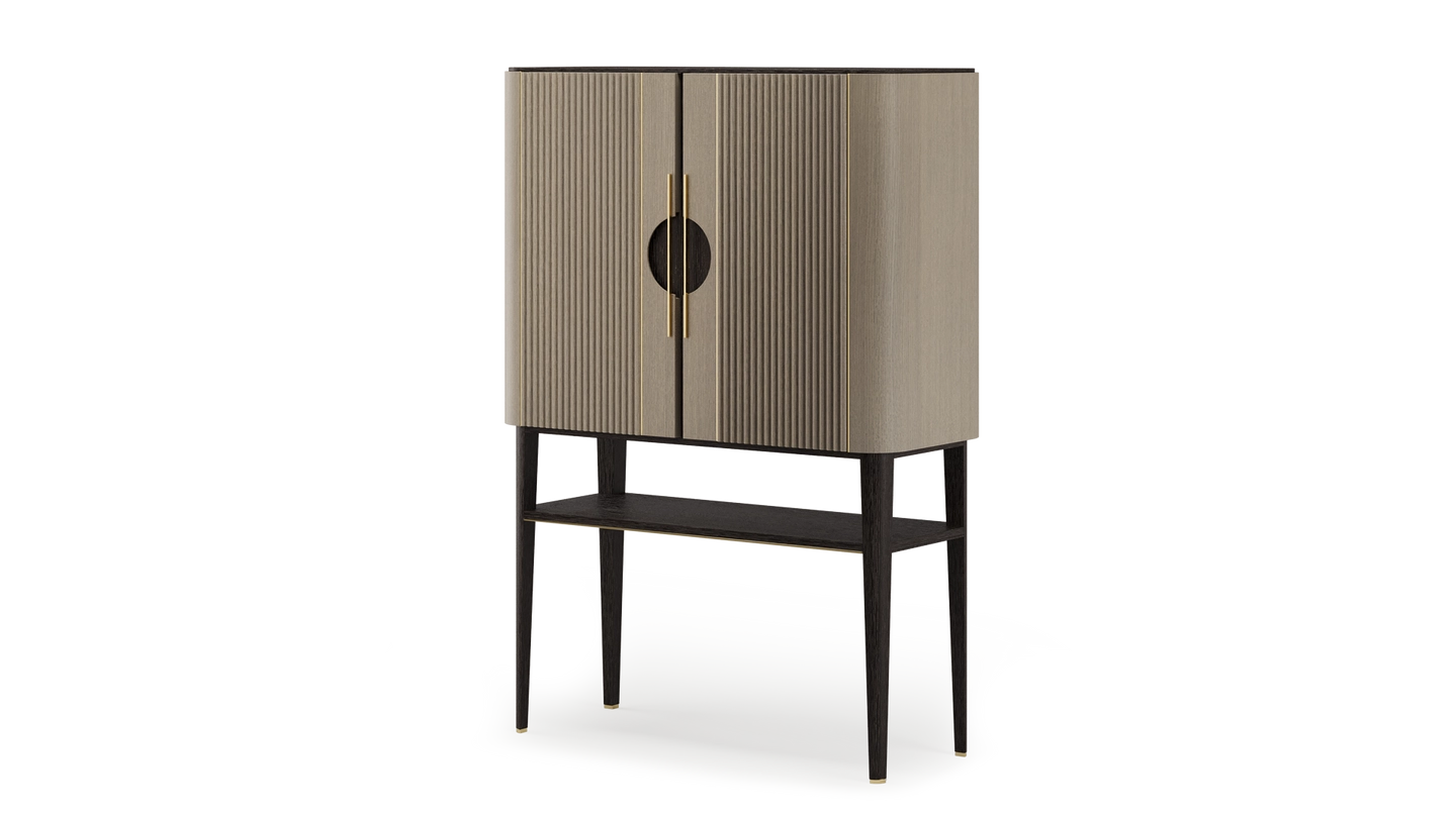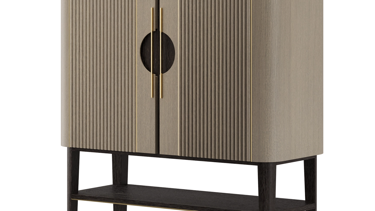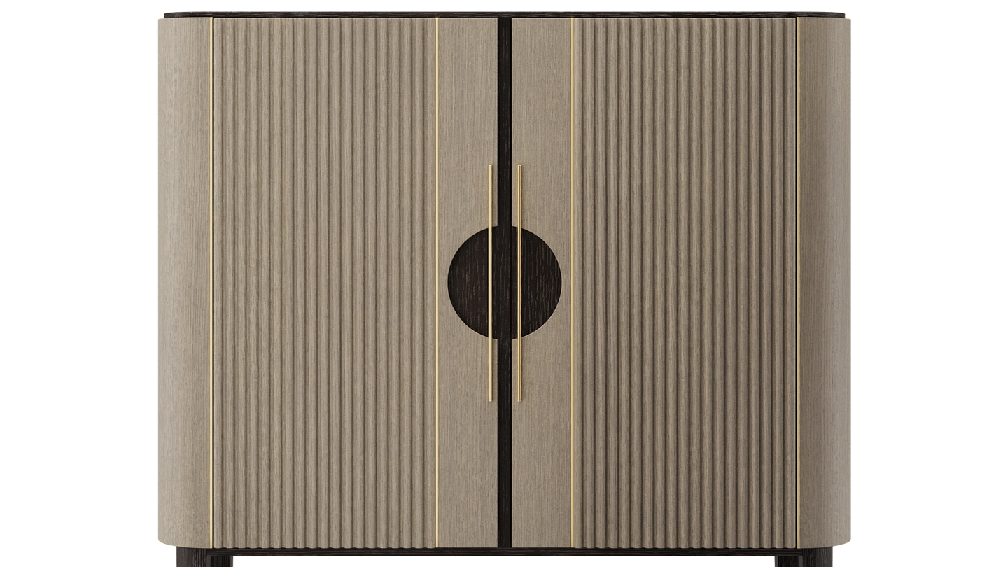 Fluted wood doors highlighted with accents of brushed brass and an open shelf distinguish the TAIPEI tall cabinet, a design with future heirloom aspirations.