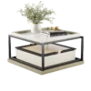 The stone top of the TARTU Coffee Table is layered over a slice of recessed lacquered wood, which creates an idiosyncratic section of shadow between the design’s surface and brushed-brass framework, which appears perfectly symmetrical or quirkily offset depending on the viewing angle.