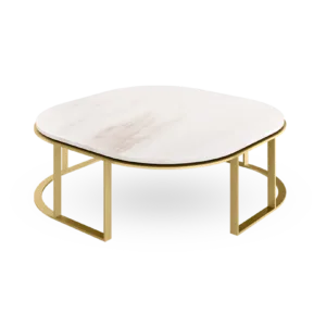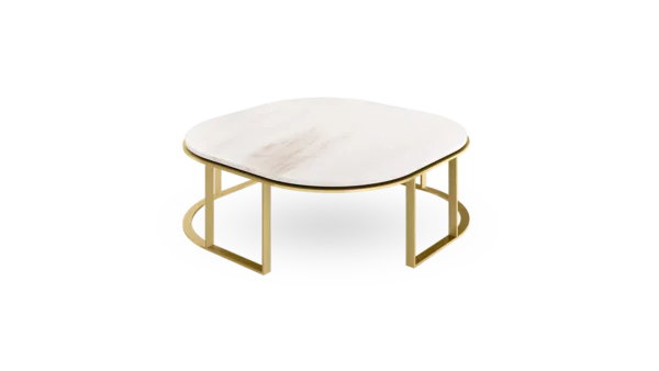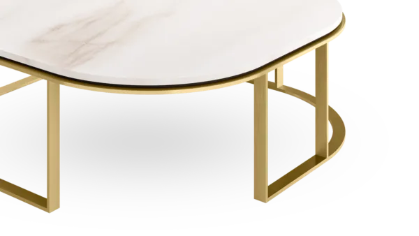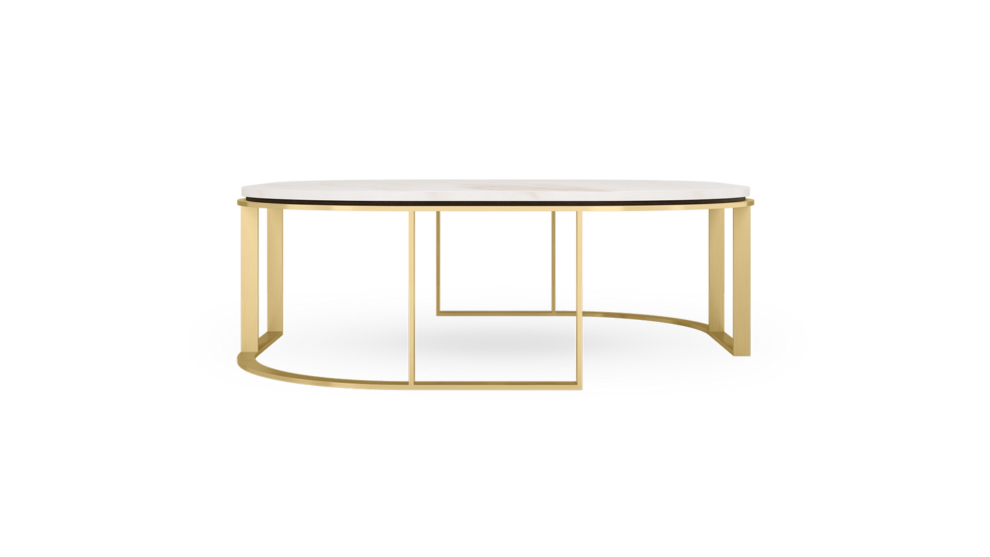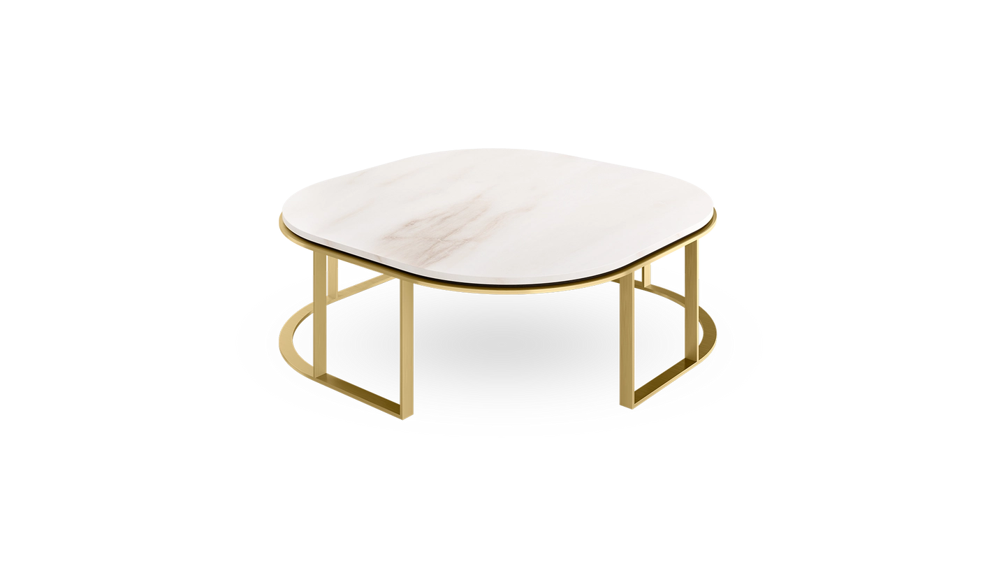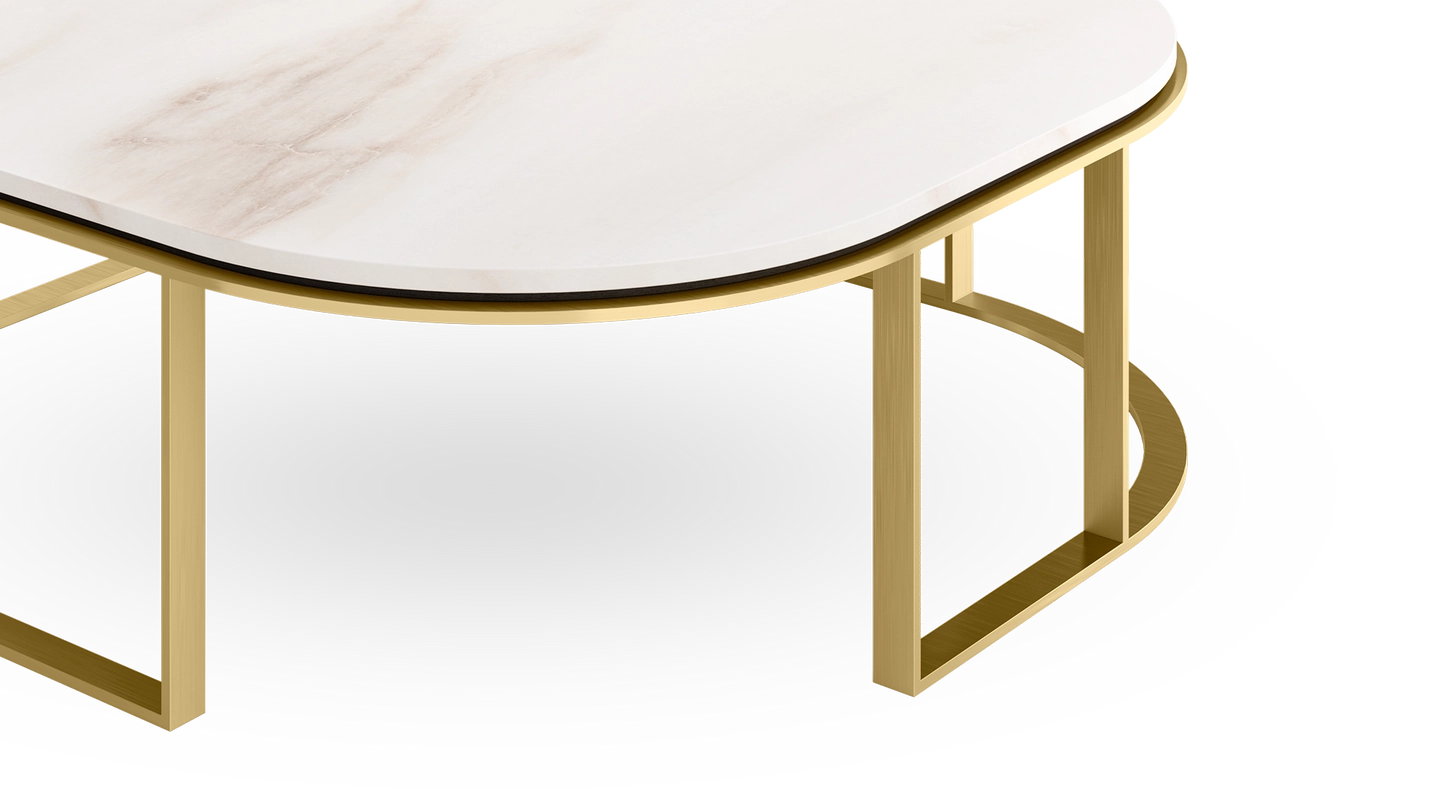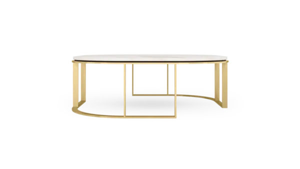 The stone top of the TARTU Coffee Table is layered over a slice of recessed lacquered wood, which creates an idiosyncratic section of shadow between the design’s surface and brushed-brass framework, which appears perfectly symmetrical or quirkily offset depending on the viewing angle.