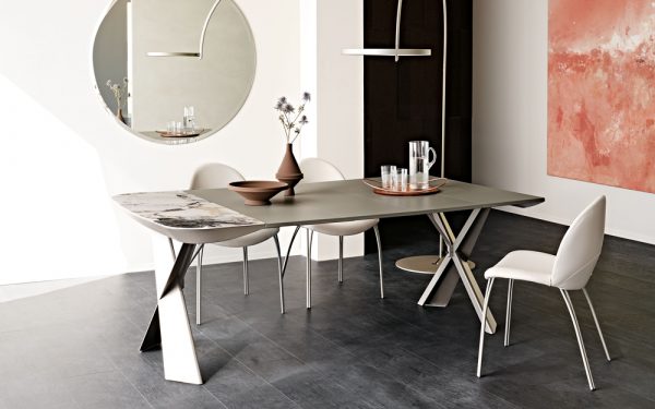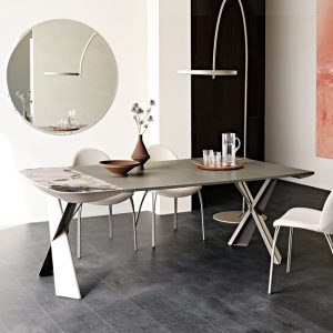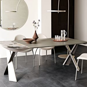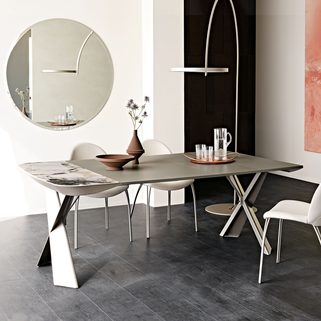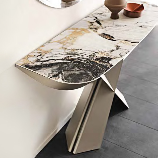 The Terminal Keramik Drive is a contemporary extendable console table with an X-shaped angular metal frame in a choice of lacquered steel finish. This is complemented by a ceramic marble top with a rounded front profile.