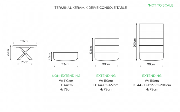 | Size | Extending – W: 119cm D: 44-122cm H: 75cm, Extending – W: 119cm D: 44-200cm H: 75cm, W: 119cm D: 44cm H: 75cm |