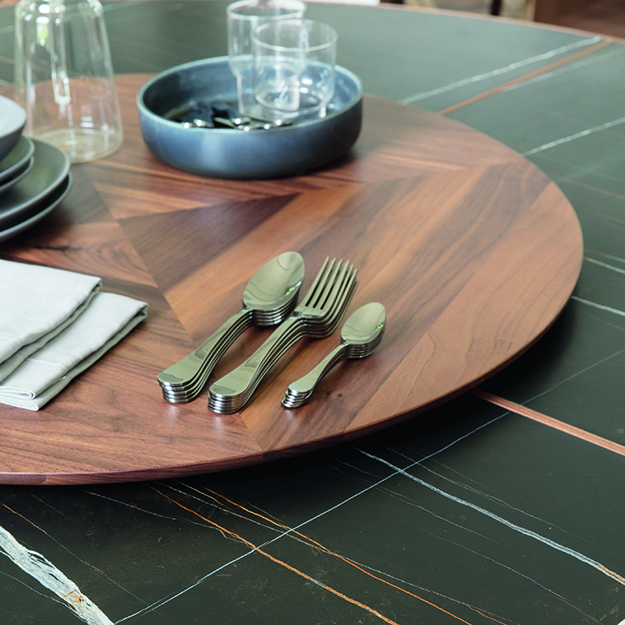 Select the frame in a range of canaletto walnut finishes. The top can be customised in solid wood to match the frame finish or a choice of marble finishes. An optional round swivelling ‘Lazy Susan’ circular tray is available in solid canaletto walnut or marble.