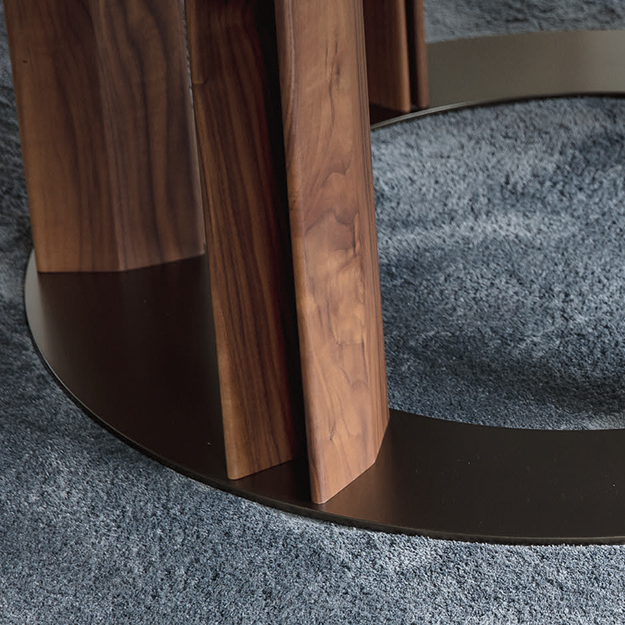 The Thayl is an opulent dining table featuring a Wood or Marble top divided into four sections with decorative linear canaletto walnut inserts. The base is composed of coordinating canaletto walnut pillars fixed to a Bronzoro metal ring base plate. Available in three round sizes with one central base or a large oval size with two bases.