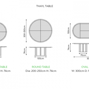 | Size | Oval – W: 300cm D: 130cm H: 74cm, Round – Dia: 160cm H: 74cm, Round – Dia: 200cm H: 74cm |