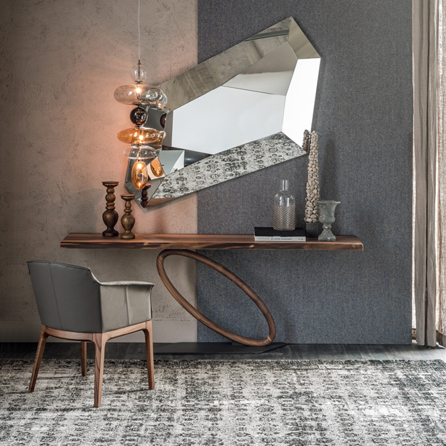 The Tour is a unique wall-mounted console design by Cattelan Italia featuring a solid Canaletto Walnut oval-shaped frame, sloping downwards from left to right to meet a parallelogram base plate in graphite embossed lacquered steel.