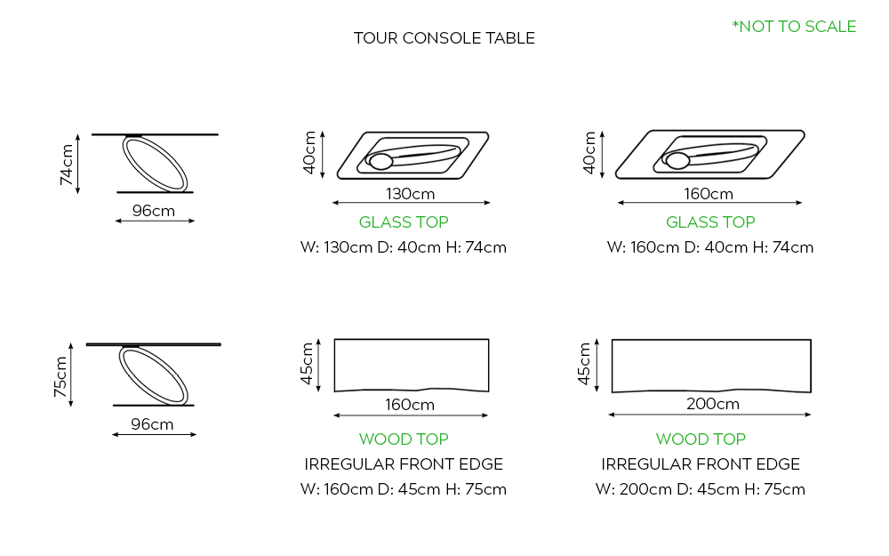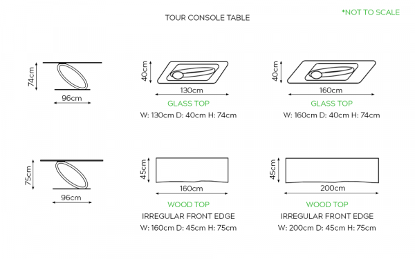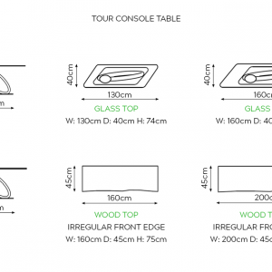 Size | Glass Top: Transparent Clear – W: 130cm D: 40cm H: 74cm, Glass Top: Transparent Clear – W: 160cm D: 40cm H: 74cm, Glass Top: Transparent Extra Clear – W: 130cm D: 40cm H: 74cm, Glass Top: Transparent Extra Clear – W: 160cm D: 40cm H: 74cm, Wood Top: Canaletto Walnut – W: 160cm D: 45cm H: 75cm, Wood Top: Canaletto Walnut – W: 200cm D: 45cm H: 75cm |