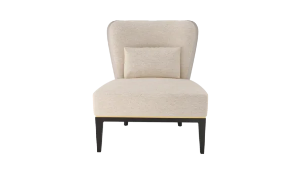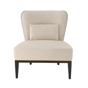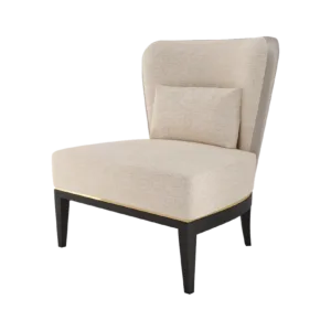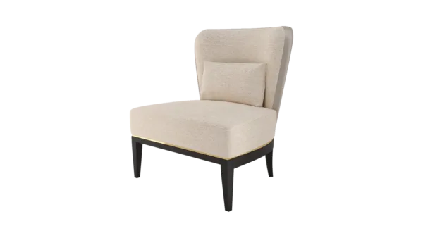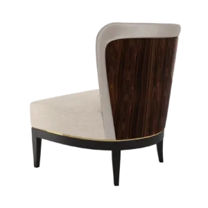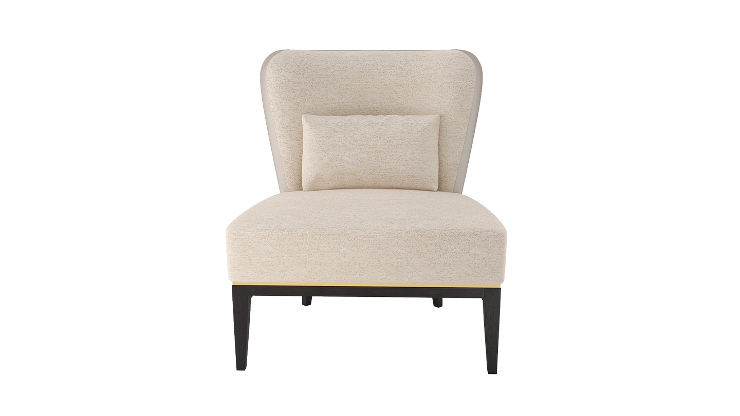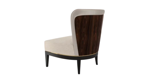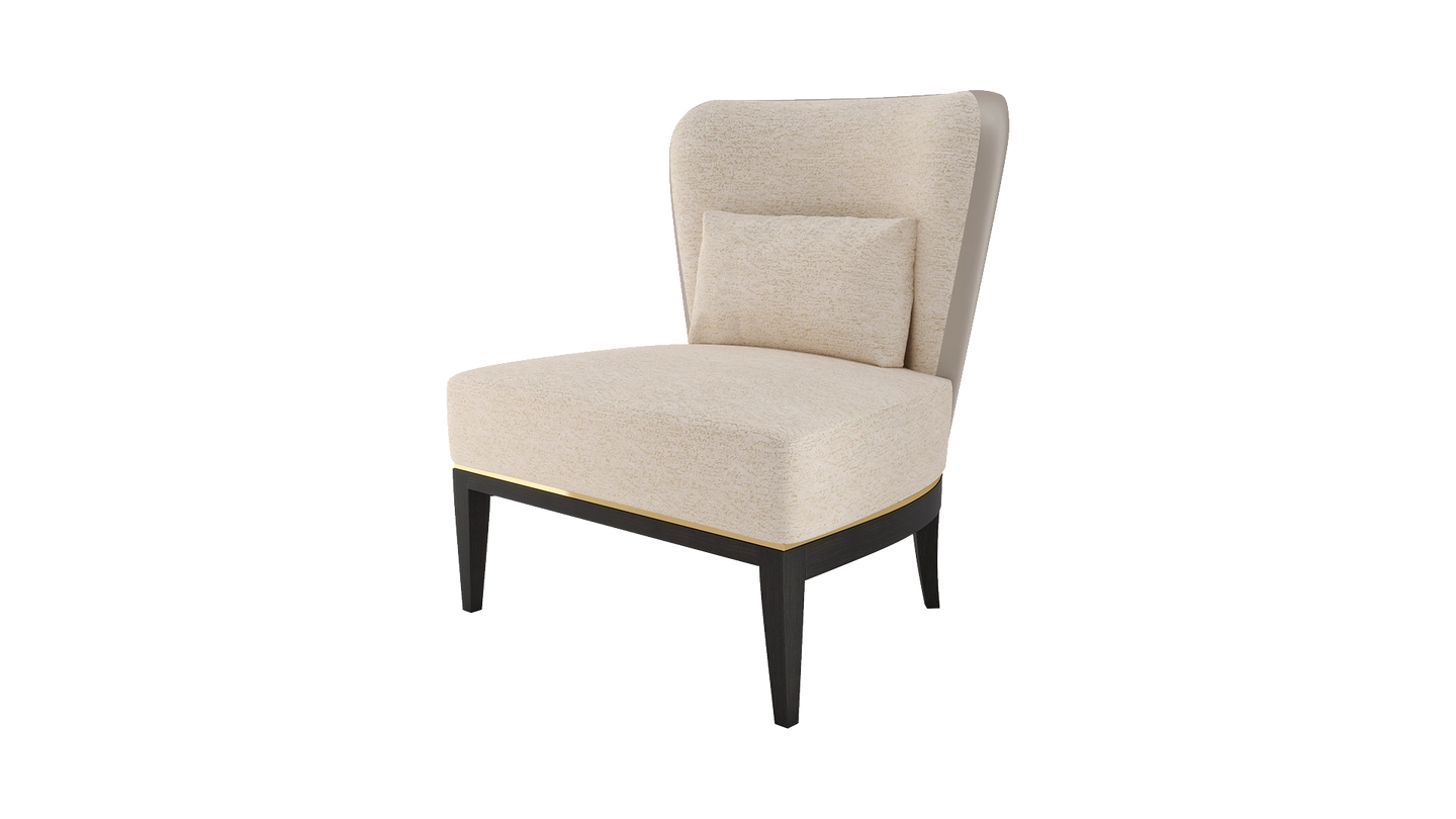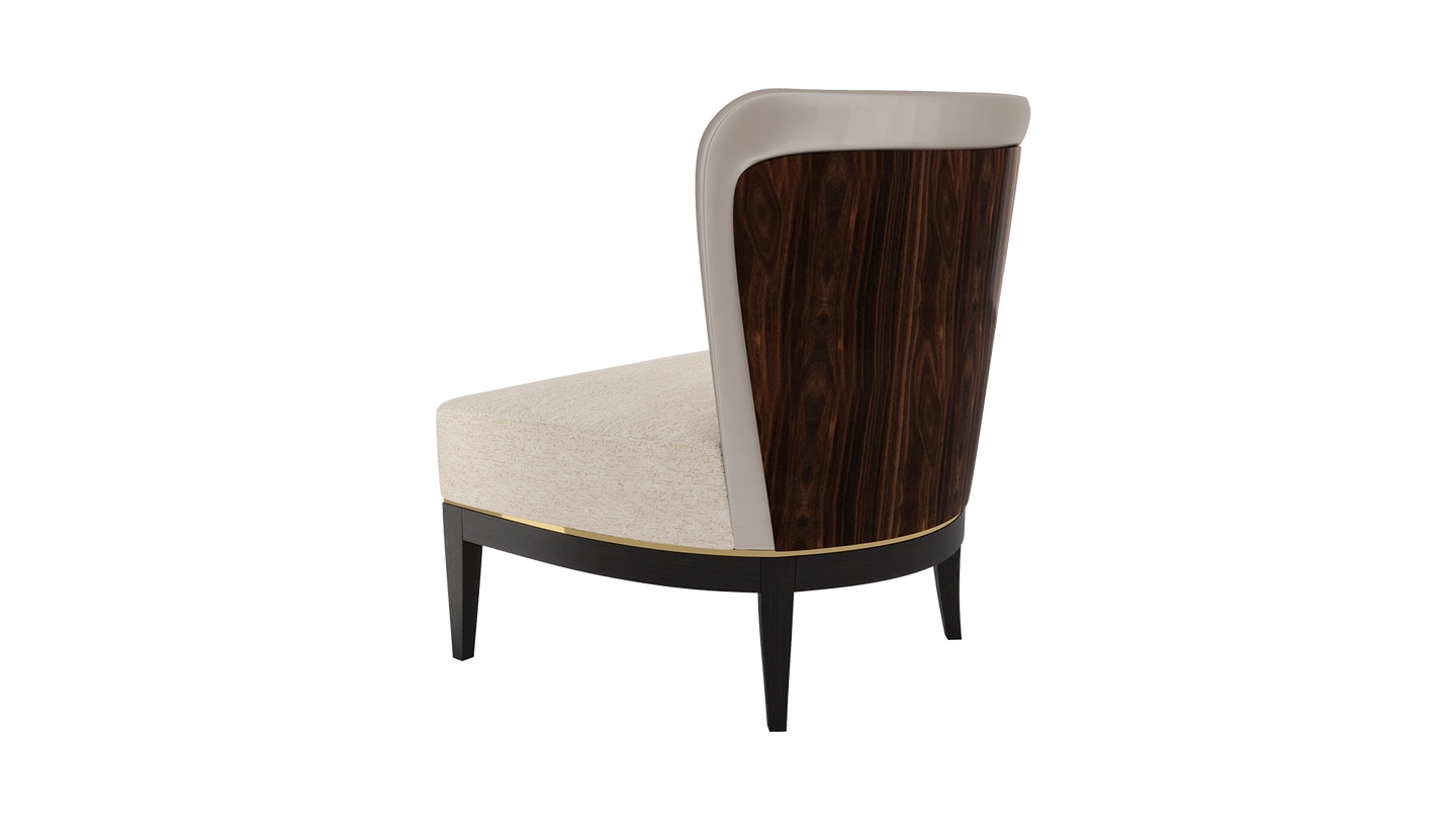 Part of a three-piece seating collection, the classic TOWNSVILLE chair provides a masterclass in delicately mixing materials by combining fabric and satin upholstery with a wood veneer back, solid wood base and embellishments of brushed brass.