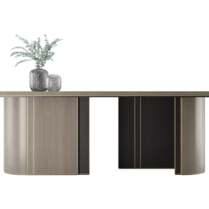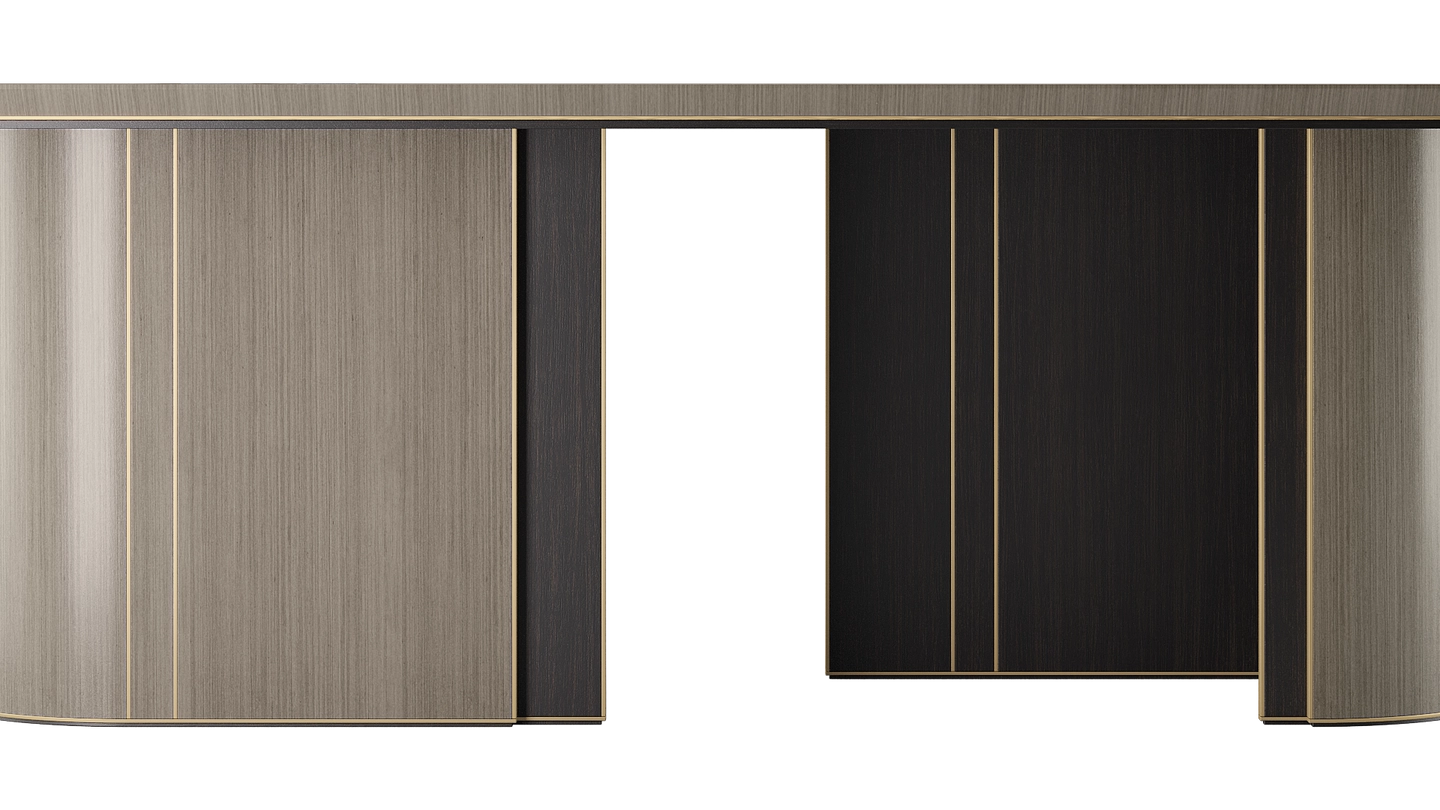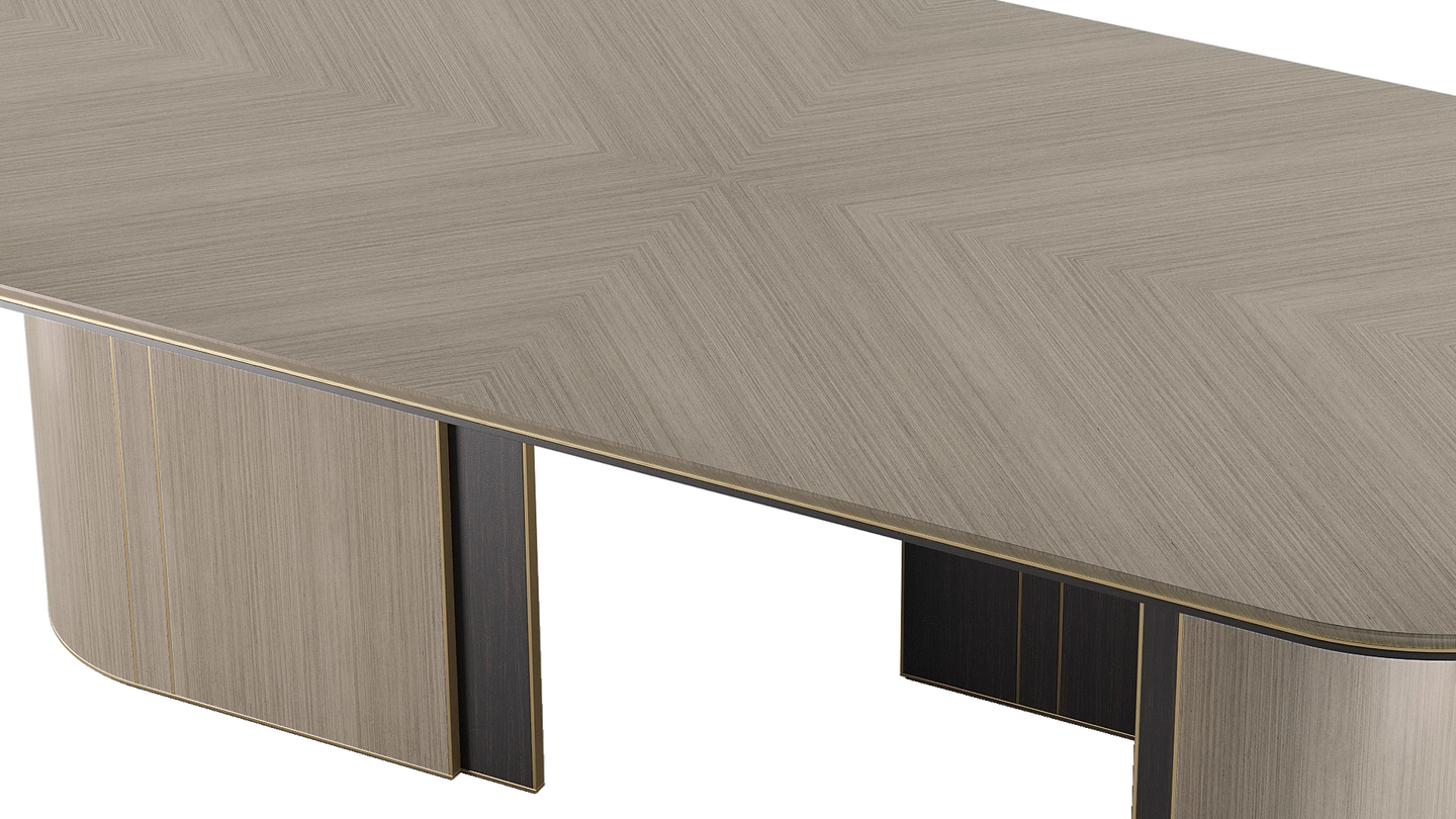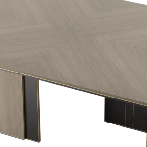 The cutting-edge TRENTO Dining Table’s wood veneer surface has been skilfully crafted to form a striking X-shaped pattern while the intriguing J-shaped legs are fashioned from overlapping layers of wood veneer in contrasting tones of light and dark.