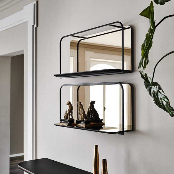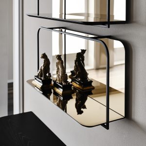 Tresor is an elegant three-dimensional wall mirror in bronze mirrored glass featuring a protruding steel frame with a convenient shelf and surround in black embossed lacquered steel.