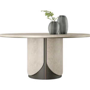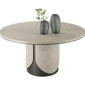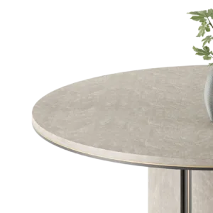 The stylish TREVISO design adds a contemporary twist to the form of a classic circular dining table with pedestal base, playing with dark and pale wood veneer to create an optical illusion that hints at an alternative silhouette.
