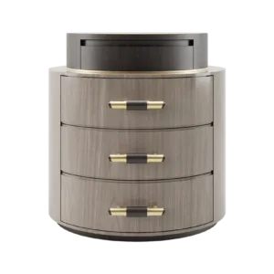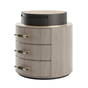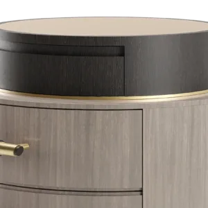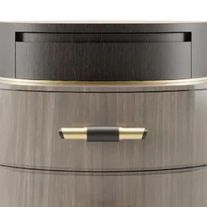 A sleek circular design featuring three suede-lined drawers, the wood veneer and brushed-brass TULSA bedside table has an ace up its sleeve: a surface pedestal topped with bronze mirror. Accessorise with a complementary table lamp and it will playfully reflect light around your sleep space.