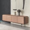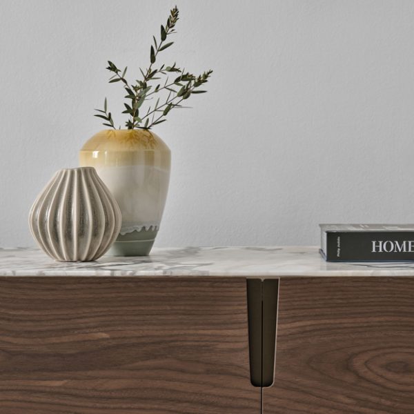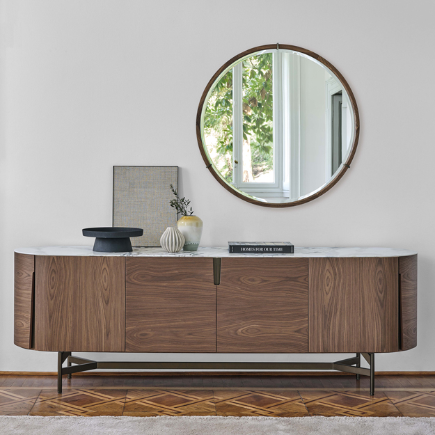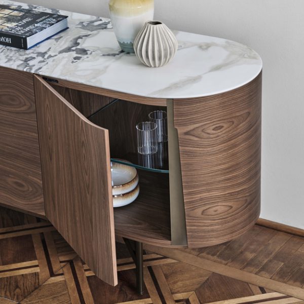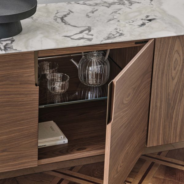 The frame can be selected in a choice of ash or canaletto walnut veneer wood. Doors are matching in shaped veneer with exposed edges and recessed metal handles in bronzoro lacquer. The top is available in matching wood or in a selection of solid marbles.