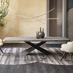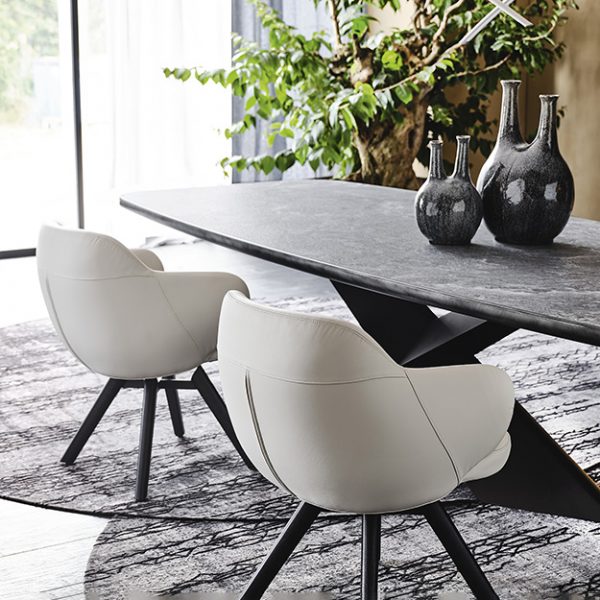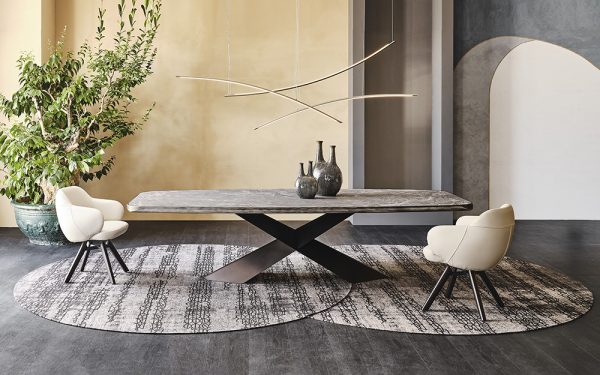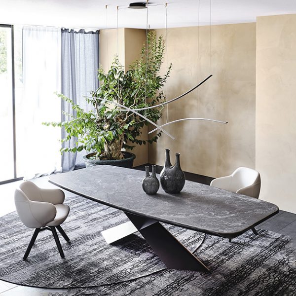 The Cattelan Italia Tyron Keramik Premium table exudes luxury elegance. Featuring a sculptural ‘X’ base in lacquered steel that supports a ceramic top with brushed bronze or brushed grey lacquered and rounded edge. Available in a range of finishes and a choice of sizes.