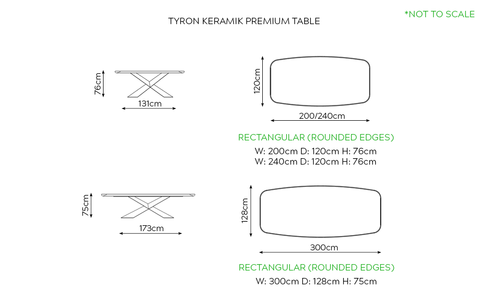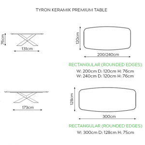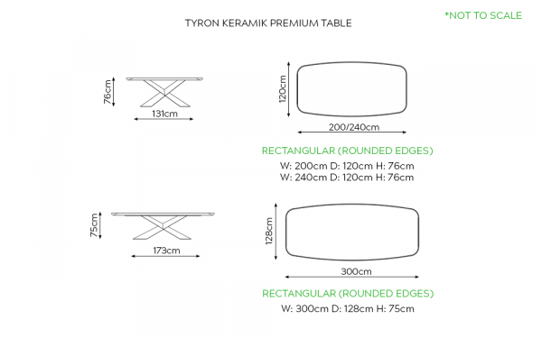 W: 200cm D: 120cm H: 76cm, W: 240cm D: 120cm H: 76cm, W: 300cm D: 128cm H: 75cm