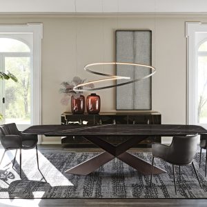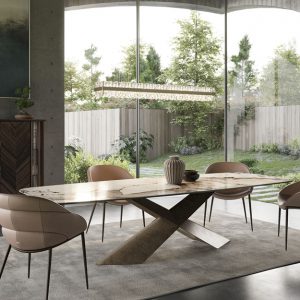 The Tyron Keramik table by Cattelan Italia makes a bold statement with an X-shaped sculptural base in lacquered steel and a sleek ceramic top. Available in a range of extending and non-extending sizes, with a choice of finishes for the frame and top.