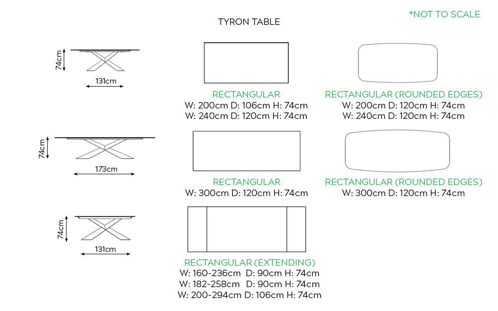 | Size | Rectangular – W: 200cm D: 106cm H: 74cm, Rectangular – W: 240cm D: 120cm H: 74cm, Rectangular – W: 300cm D: 120cm H: 74cm, Rectangular (Rounded Edges) – W: 200cm D: 120cm H: 74cm, Rectangular (Rounded Edges) – W: 240cm D: 120cm H: 74cm, Rectangular (Rounded Edges) – W: 300cm D: 120cm H: 74cm, Rectangular Extending – W: 160-236cm D: 90cm H: 74cm, Rectangular Extending – W: 182-258cm D: 90cm H: 74cm, Rectangular Extending – W: 200-294cm D: 106cm H: 74cm |