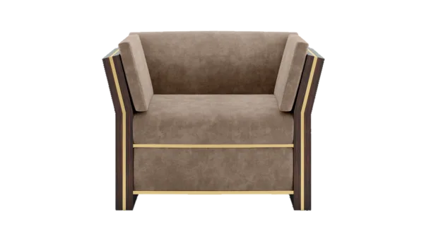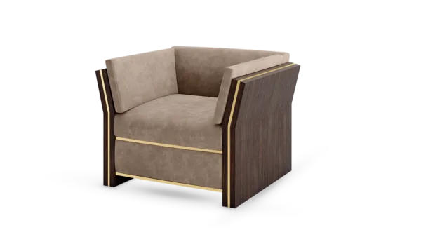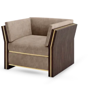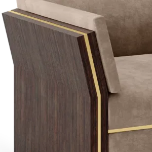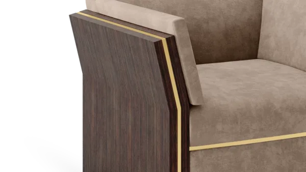 The UDAIPUR armchair uses materials in truly innovative ways. Its precisely angled arms are crafted from edifices of wood veneer with a thick metallic seam. These effortlessly suspend a smoothly upholstered seat, while side cushions offer further comfort and support.