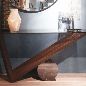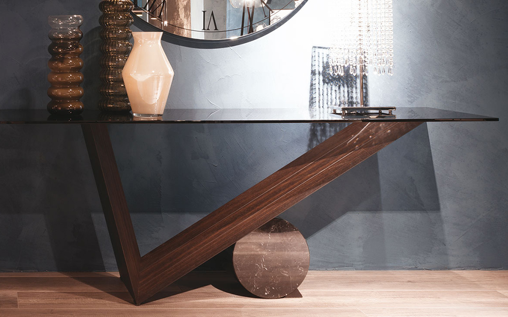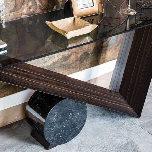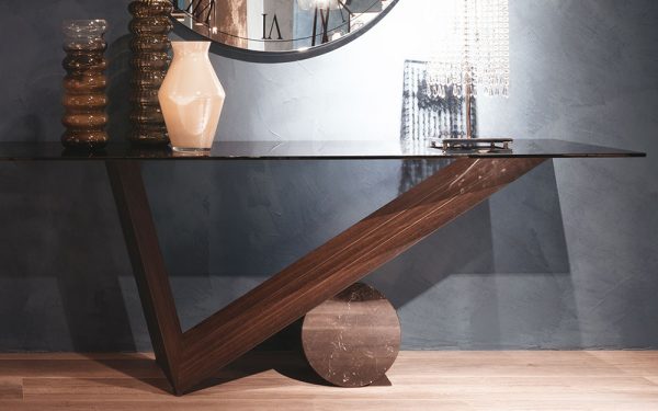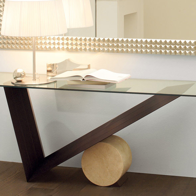 The Valentino is a stylish console table with a 12mm thick transparent clear or smoked glass top on an angular base in Canaletto Walnut or Burnt Oak. For the supporting cylinder select from natural Travertine, white Carrara Marble or black Marquina Marble.