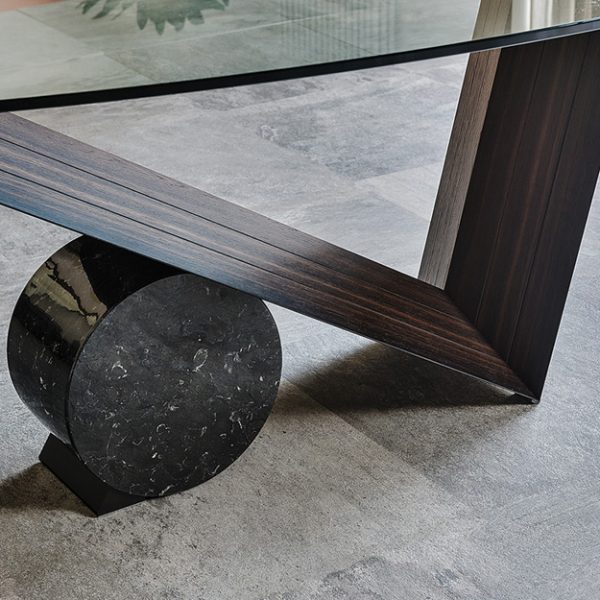 The Cattelan Italia Valentino is clear glass table with a striking V-Shaped Base in canaletto walnut or burnt oak and complementing cylinder in Travertine, black Marquina or white Carrara marble. Available as a rectangular, oblong, oval or irregular oval shaped table.