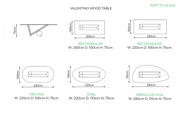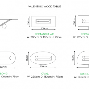Size | Irregular Oval – W: 240cm D: 115cm H: 75cm, Oblong – W: 220cm D: 100cm H: 75cm, Oval – W: 220cm D: 110cm H: 75cm, Rectangular – W: 200cm D: 100cm H: 75cm, Rectangular – W: 220cm D: 100cm H: 75cm |