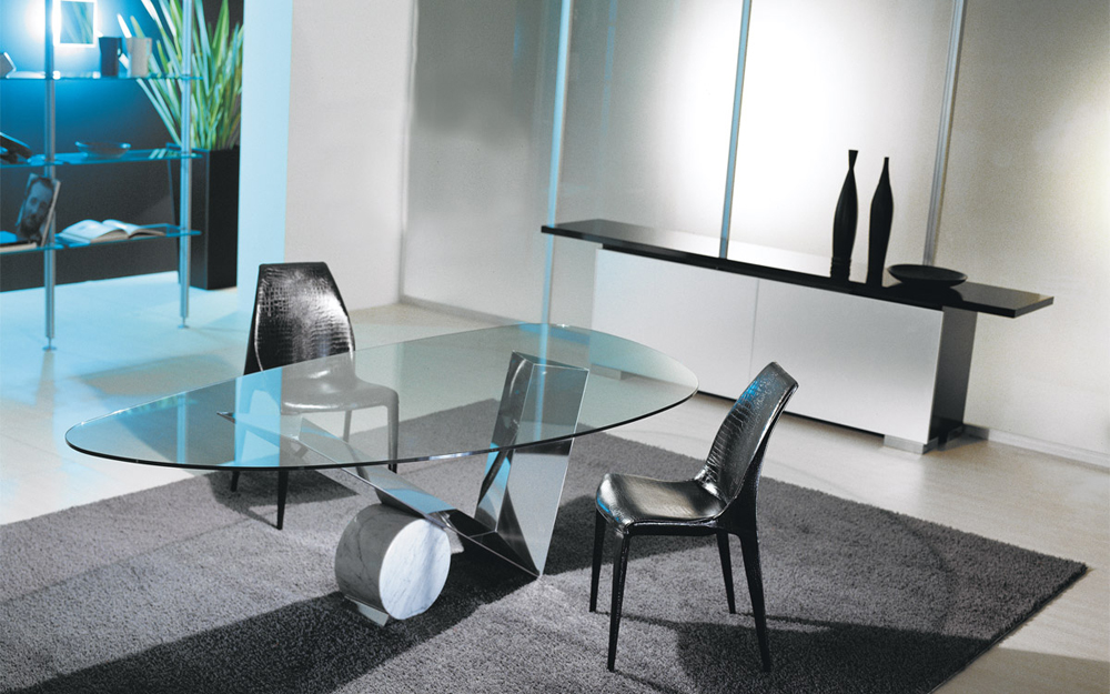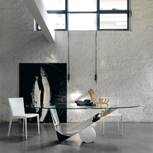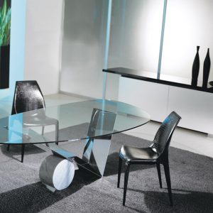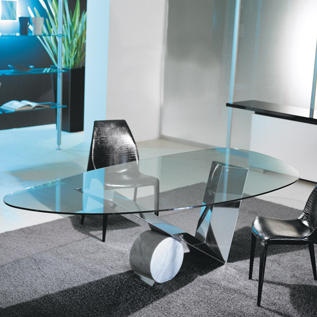 The Cattelan Italia Valentinox is a clear glass table with a striking V-Shaped hand-finished base in stainless steel with a complementing cylinder in travertine, black Marquina marble or white Carrara marble.