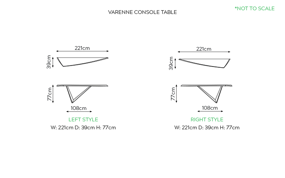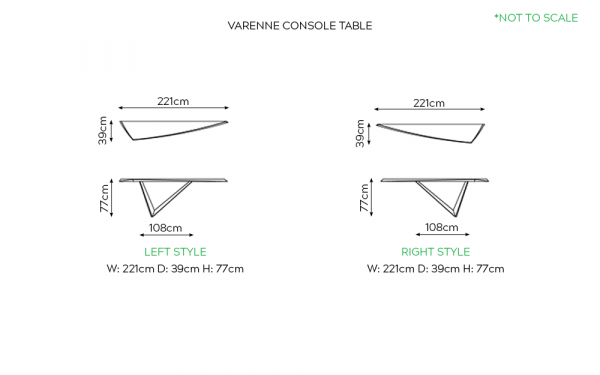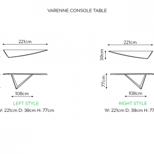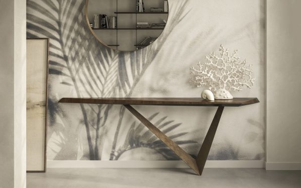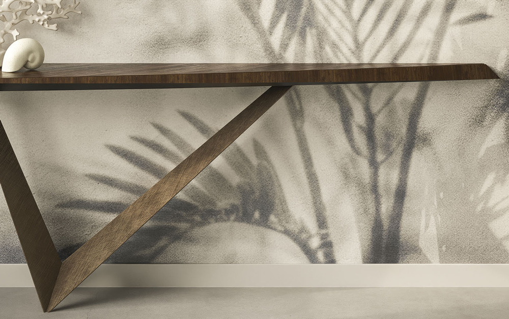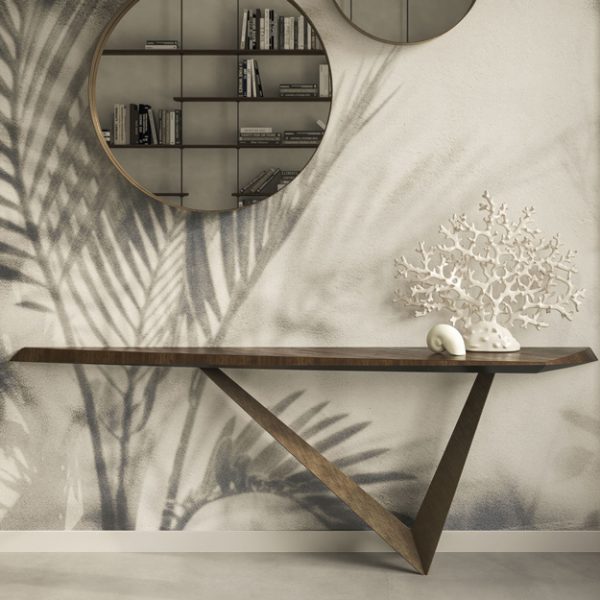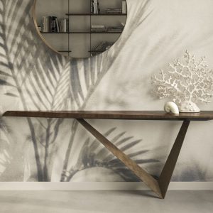 The Varenne Console by Cattelan Italia is a sophisticated console with an angular asymmetrical base that gives the illusion of defying gravity, available in a choice of lacquered metal finish.