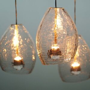 The Veil Light is made from mouth blown glass, cracked and reformed in the kiln. The light is captured by the fissures in the glass casting delicate patterns of light and shade.