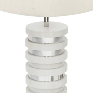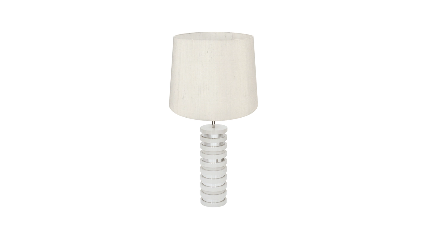 Designed to standout, the opulent VENEZA table lamp features alternating sections of white lacquered wood and light-reflecting polished stainless-steel. Topping off the design is a conical shade woven from double silk.