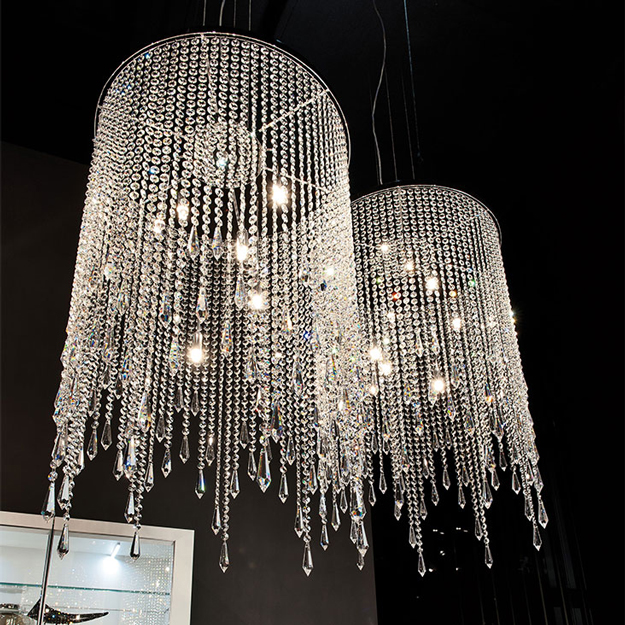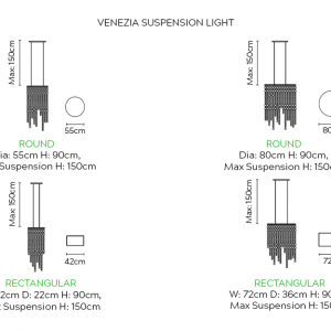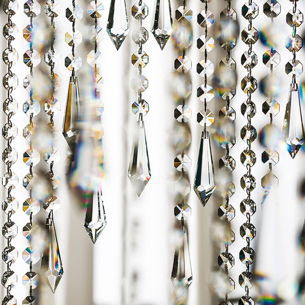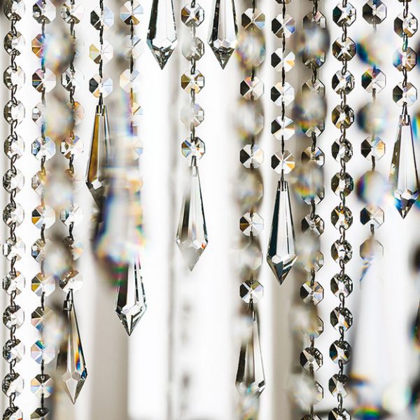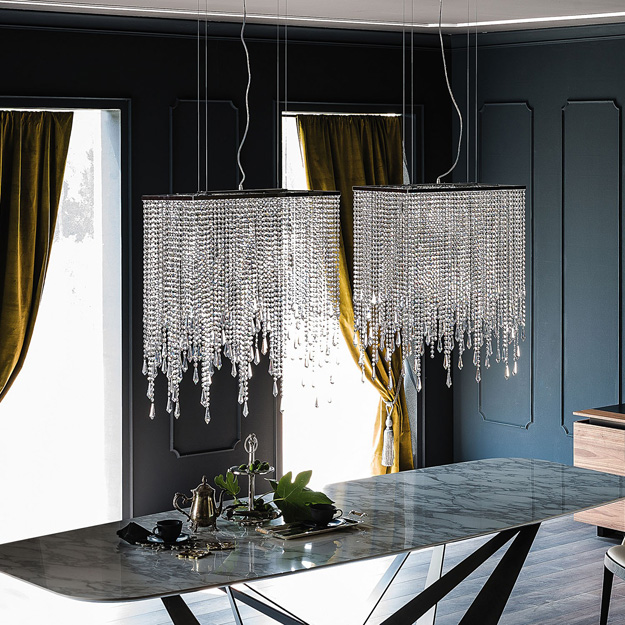 The Venezia suspension light is an eye-catching design feature that creates a shimmering light around a room. Delicate glass pendants that resemble a raindrop appearance lend an elegant feel and are suspended from a sleek chromed steel frame.