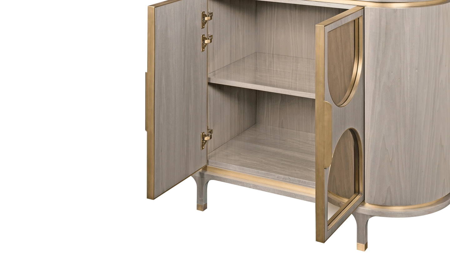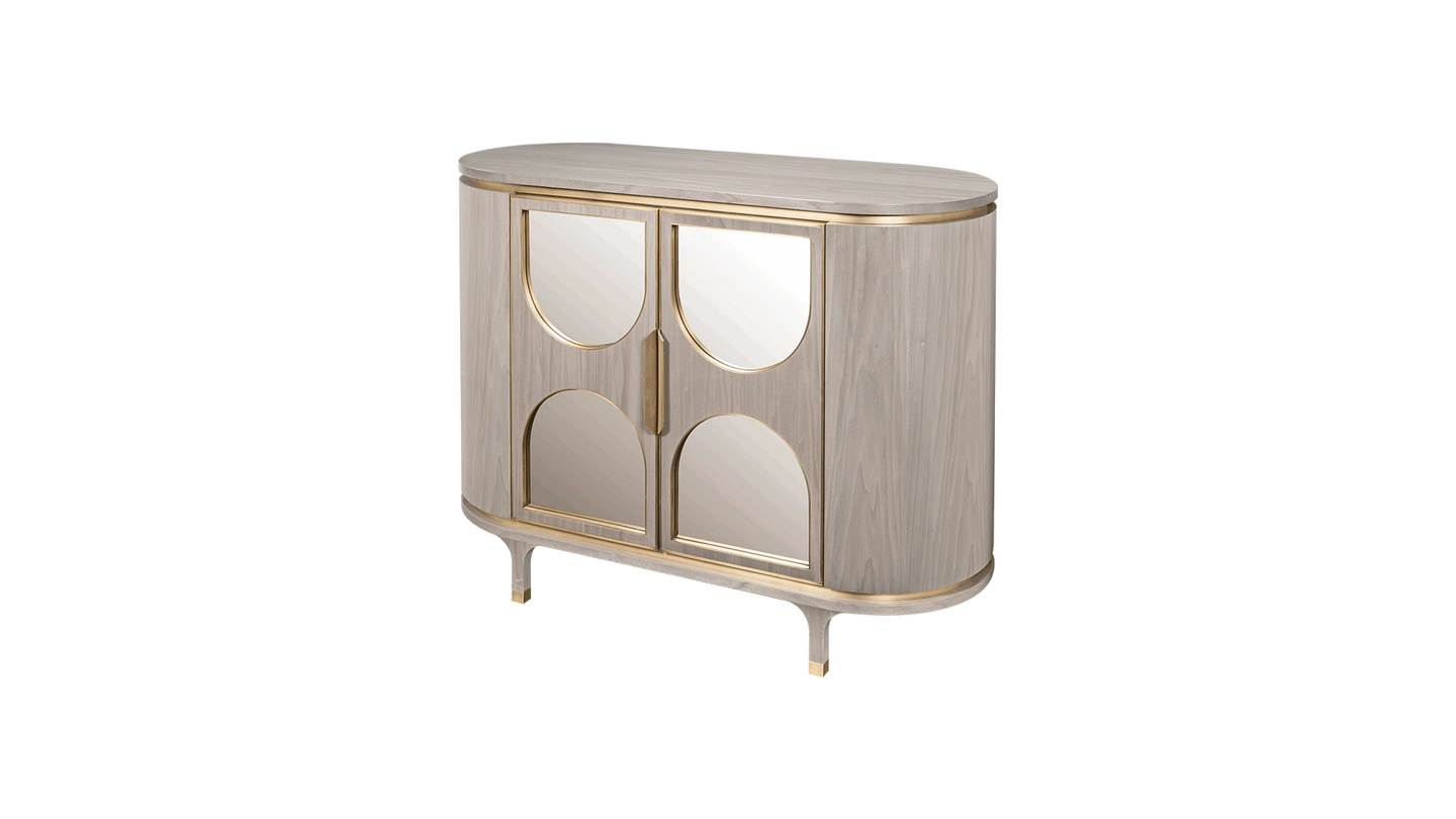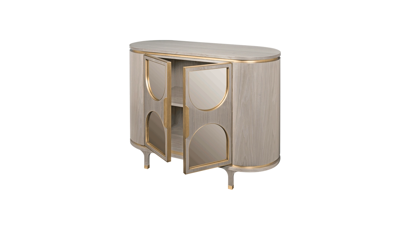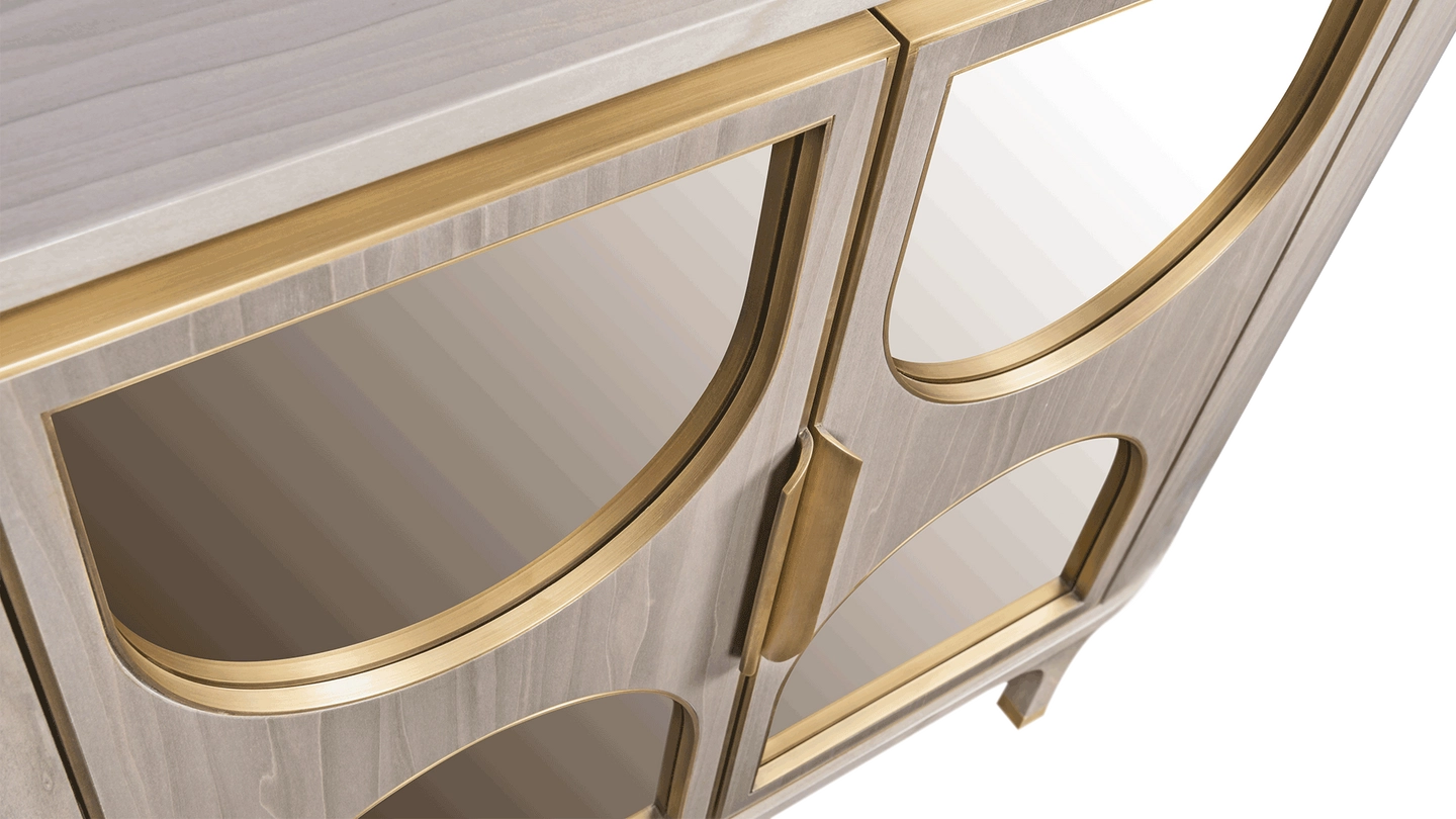 One for romantics, the VERONA cupboard brings the glamour to storage with its soft curves and mirrored arches. Highlights of brushed brass work beautifully with the glossy wood veneer, while kitten-heel-style legs ensure a graceful finish.