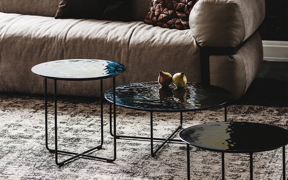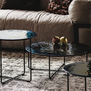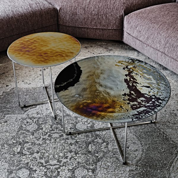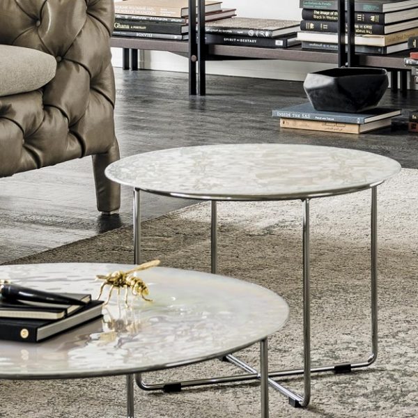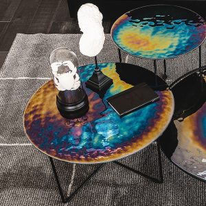 An eclectic and stylish collection of coffee tables from Cattelan Italia, the Vinyl is available with either a Chromed Steel, Embossed Titanium or Embossed Black Lacquered Steel frame paired with a Murano artistic glass top in Petrolio or Madraperla. Please note the effect on every table will vary.