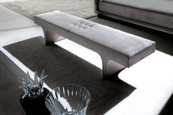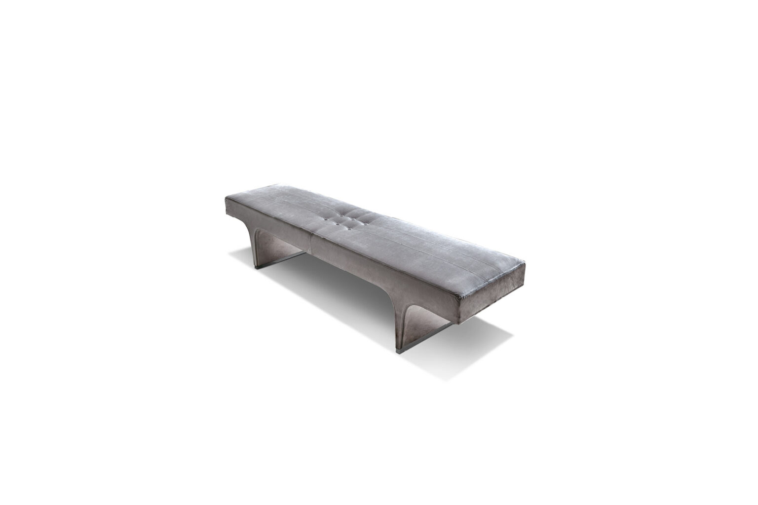 Upholstered bench available in lizard printed leather, first grade leather, nabuk leather, velvet, velour or suede fabric. Base in combination of storm dark grey finish stainless steel with white maple fine lines inlay.